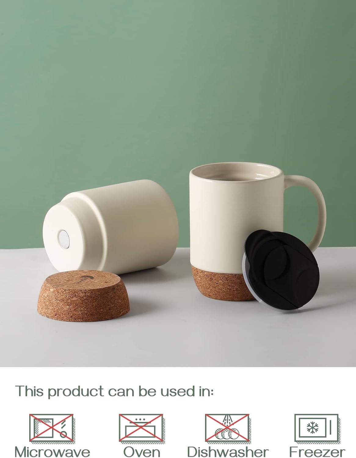 DOWAN Coffee Mugs Set of 2, 15 OZ Ceramic Mug with Cork Bottom and Splash Proof Lid, Large Coffee Cup with Handle for Tea Latte, Beige
