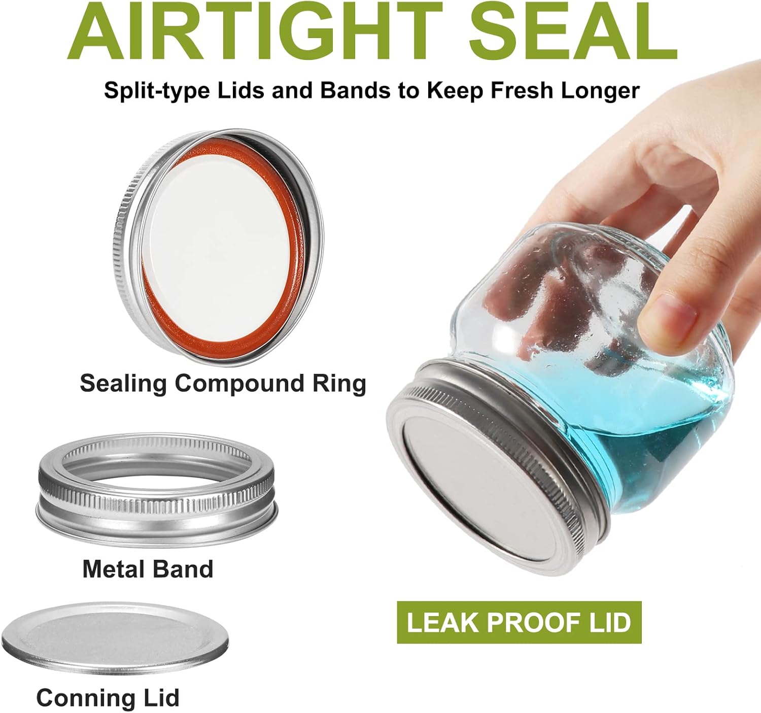 - Package include: 24 Pack 8oz/240ml mason jars with silver split-type screw metal lids; Size: 2.9 inch(Base Width) x 3.1 inch(Height) x 2.75 inch(Regular mouth)