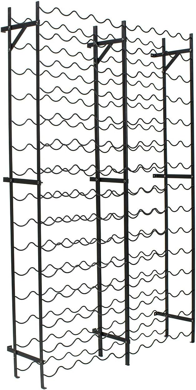 - STURDY DESIGN — Made of durable metal construction with smooth black finish — Features 15 rows of scallop/wave shaped shelves — Solid structure prevents wobbling, tilting, or falling — Holds most standard wine bottles — Wine Bottles NOT INCLUDED — Measures approximately 38” L x 9.50” W x 59.50” H (Approx 3.75” between each tier)