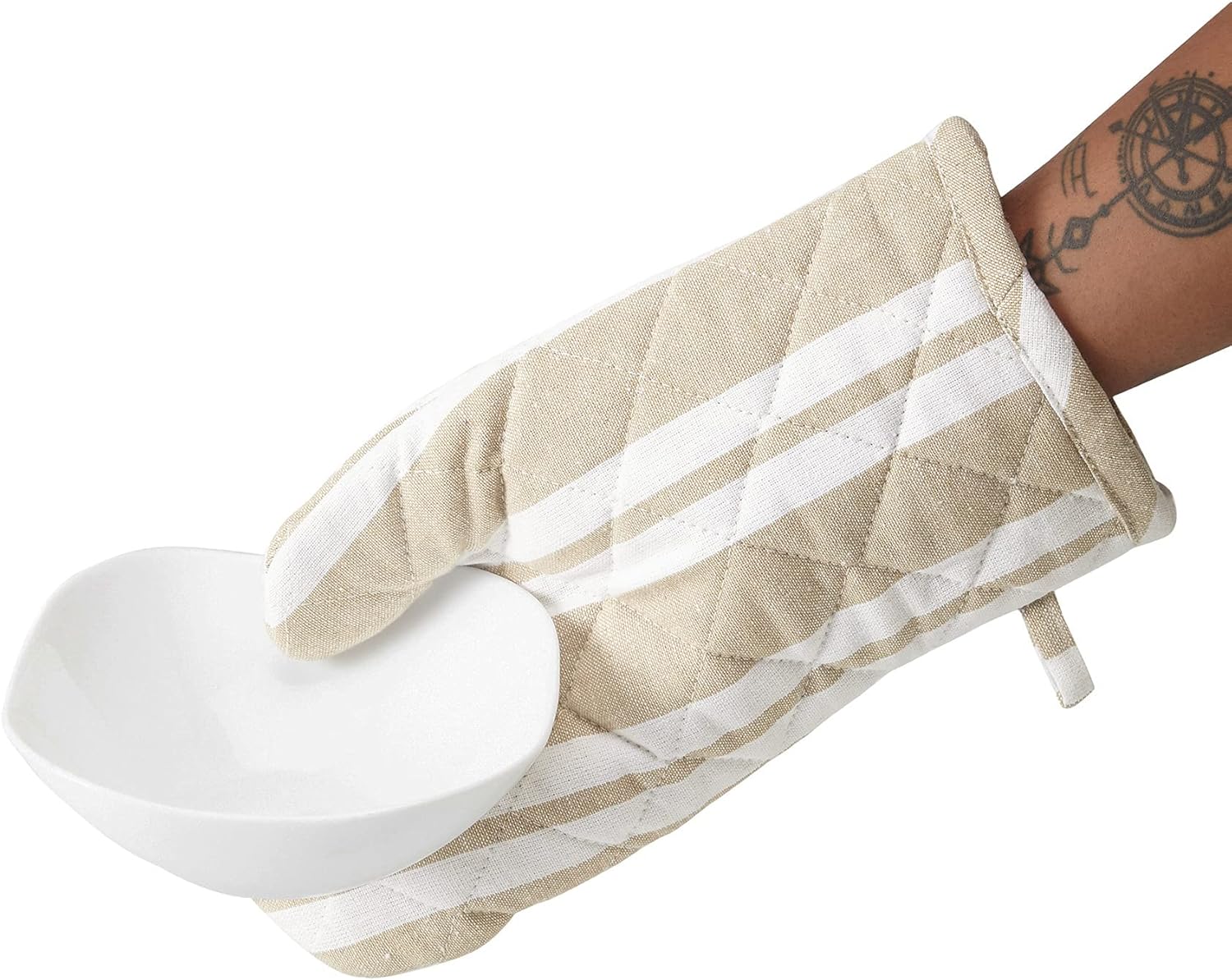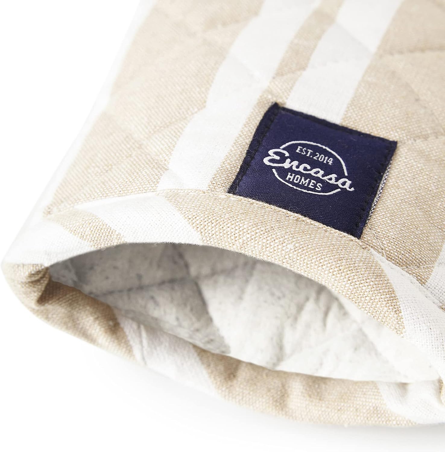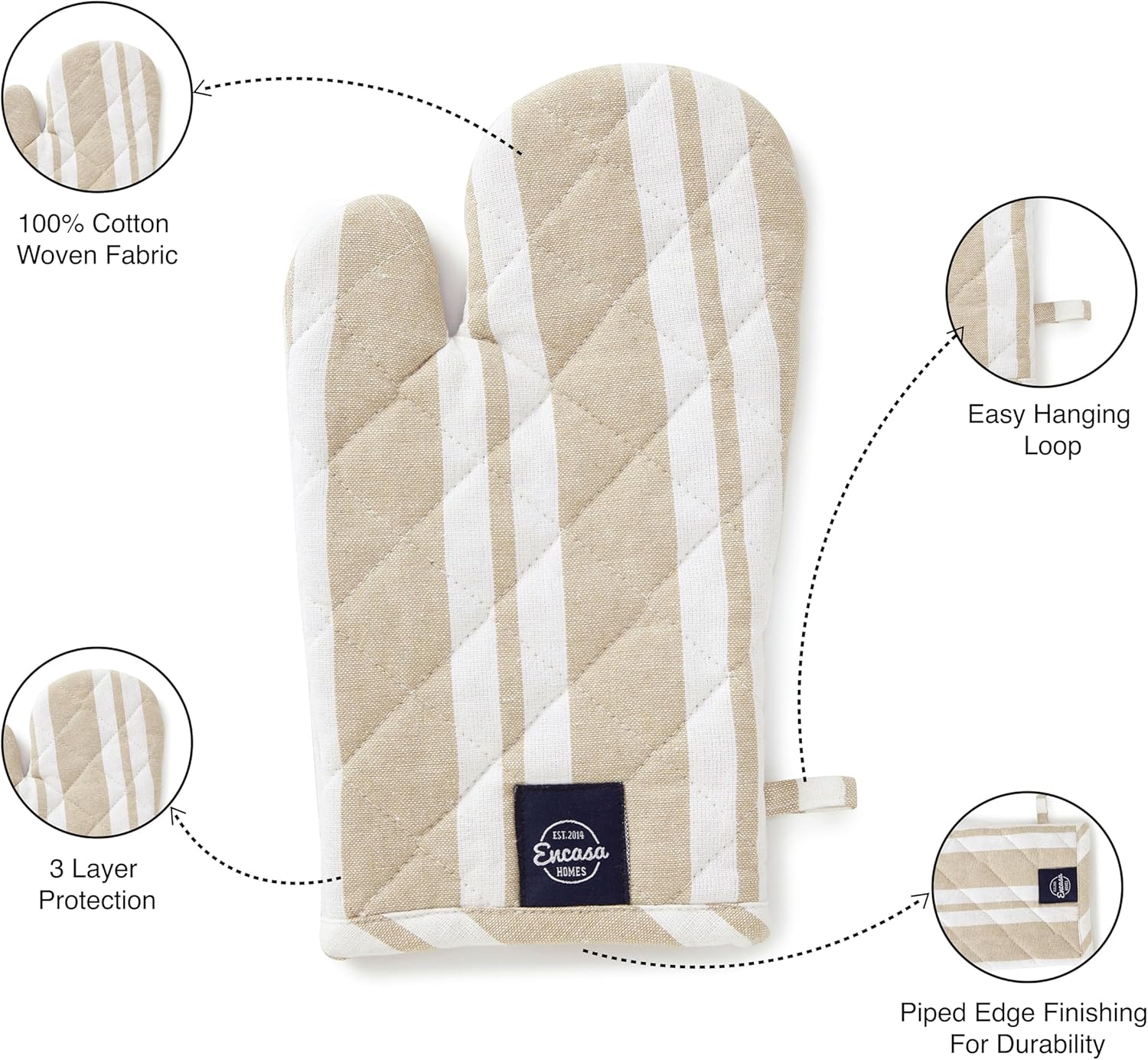 Encasa XO Long 12"x7" Oven Microwave Hand Gloves Mitts (2 pc Set) for Kitchen Cooking & Baking - Heat Resistant, Thick & Safe, Protection of Hands from Hot Utensils - Franca Beige Stripes