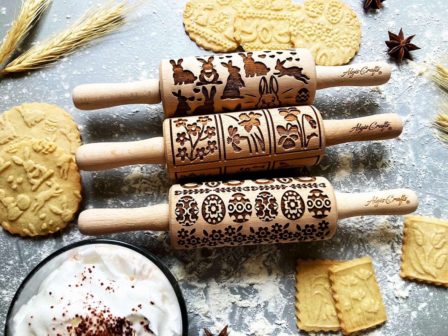 EASTER 3 Mini Embossed Rolling Pin Set. Wooden Laser Cut Embossing Rolling Pins for Embossed Cookies. Easter, Rabbit, Egg, Chicken, Spring, Flowers from Algis Crafts