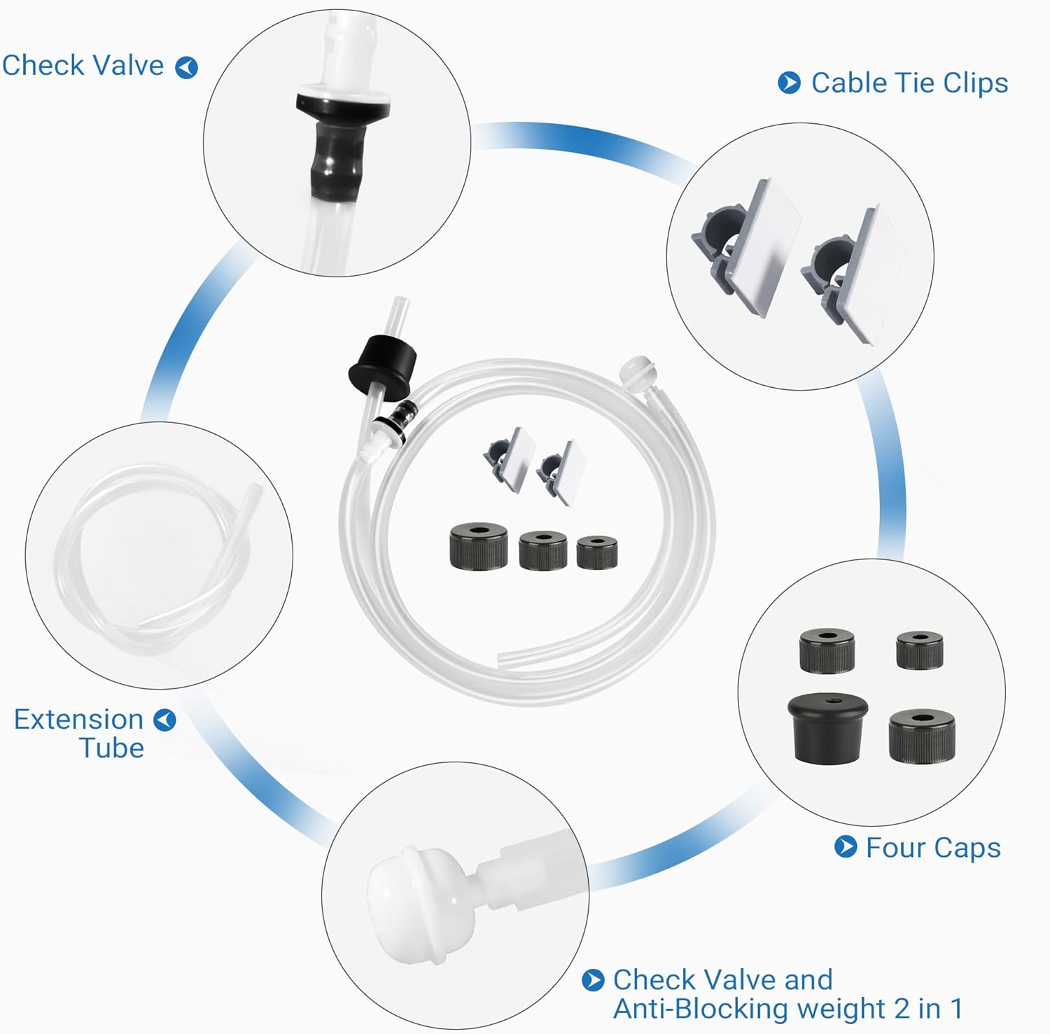 - WHAT YOU GET: 4 bottle caps to fit all bottles, a check valve,47" extension tube, anti-leak accessories, and 2 punch-free cable tie clips. NO KITCHEN SOAP DISPENSER INCLUDED.