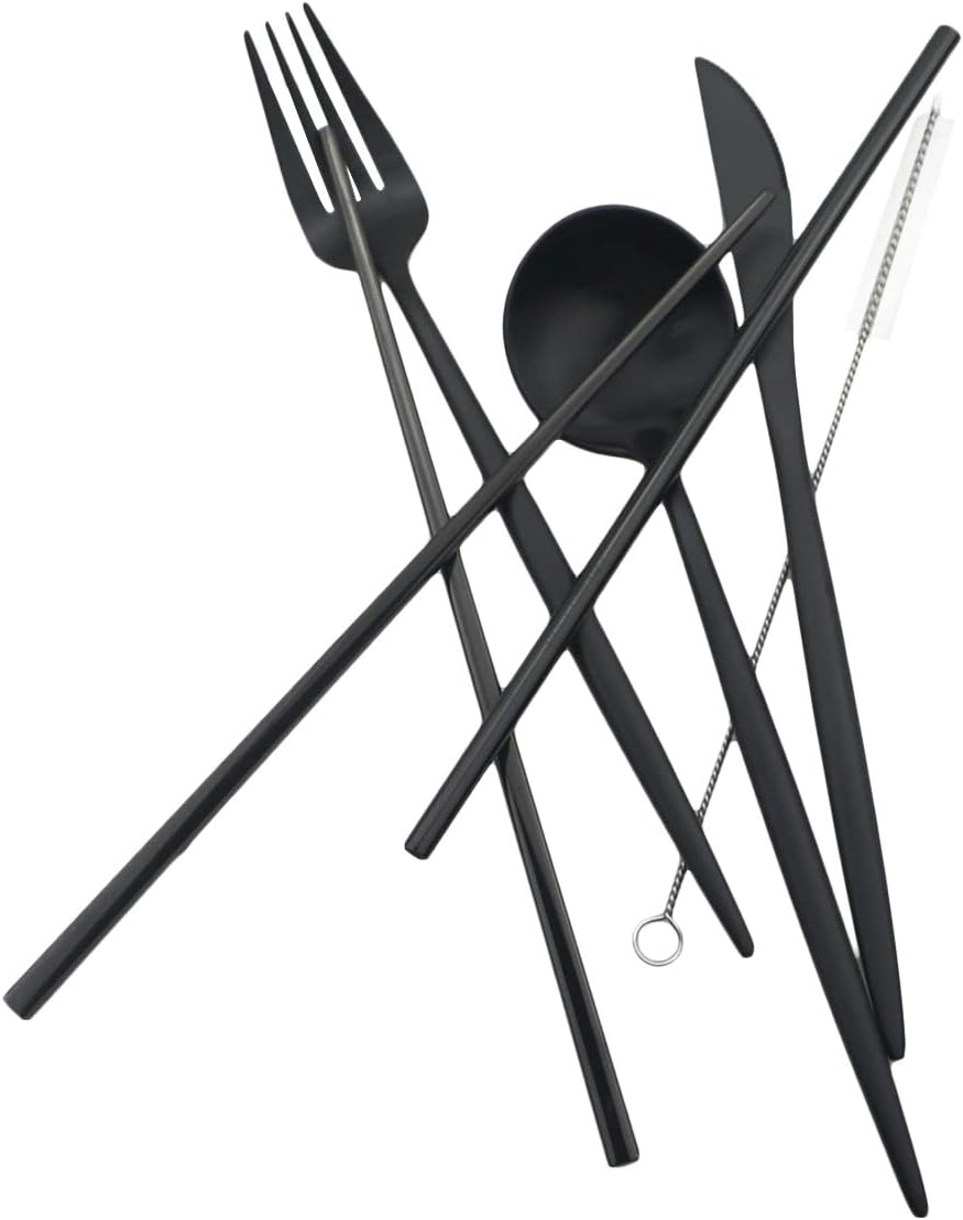 - Perfect Size & 7-Piece Travel Flatware Set Includes - Dinner knife, dinner fork, dinner spoon, chopsticks, cleaning brush, straight straw, carrying case. Suitable for travel, camping, school, flight or workplace.The cutlery is compete in size and light in weight, making it easy to carry around. The 7-piece portable Silverware set is a must-have for daily use, camping, and home travel.