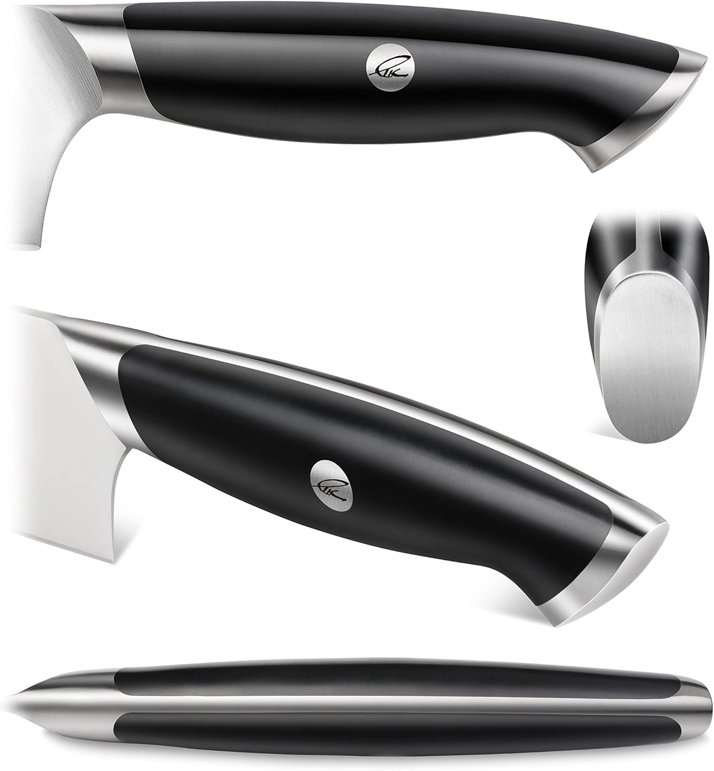 - Durable white polymer handles are contoured for a comfortable and ambidextrous grip. Polished bolster promotes a comfortable chef's grip. Angled stainless-steel end cap adds beauty and balance.