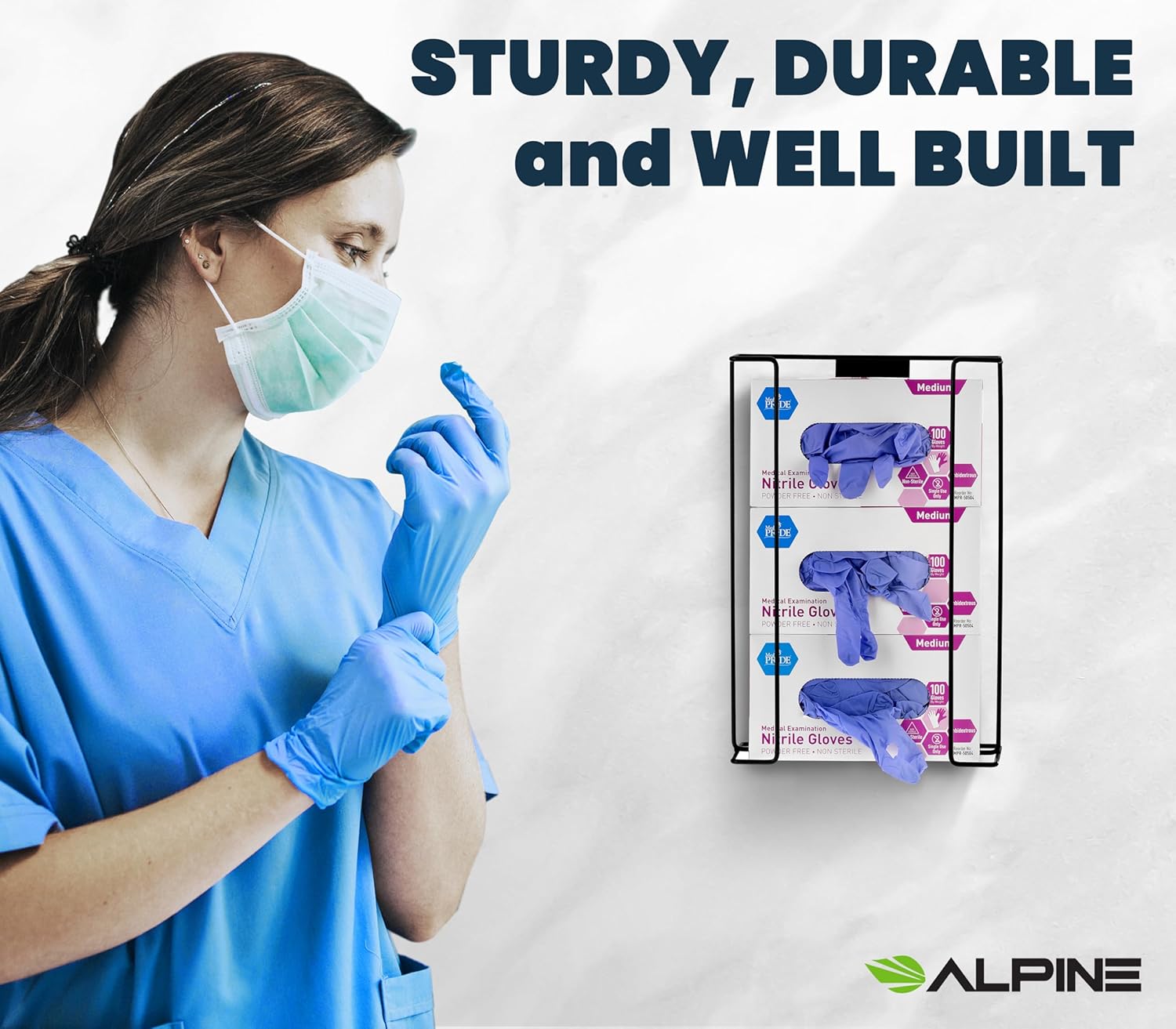 - COLOR OPTIONS. Accommodating two boxes of gloves, the Alpine Industries Dispenser is universally designed to fit most glove brands of medium size. The modern style dispenser is available in a white or black finish to appeal to everyone’s taste.