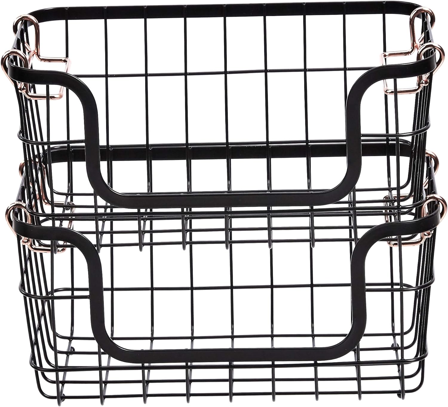 - Set of 2 black wire storage baskets with rose gold handles for home organization