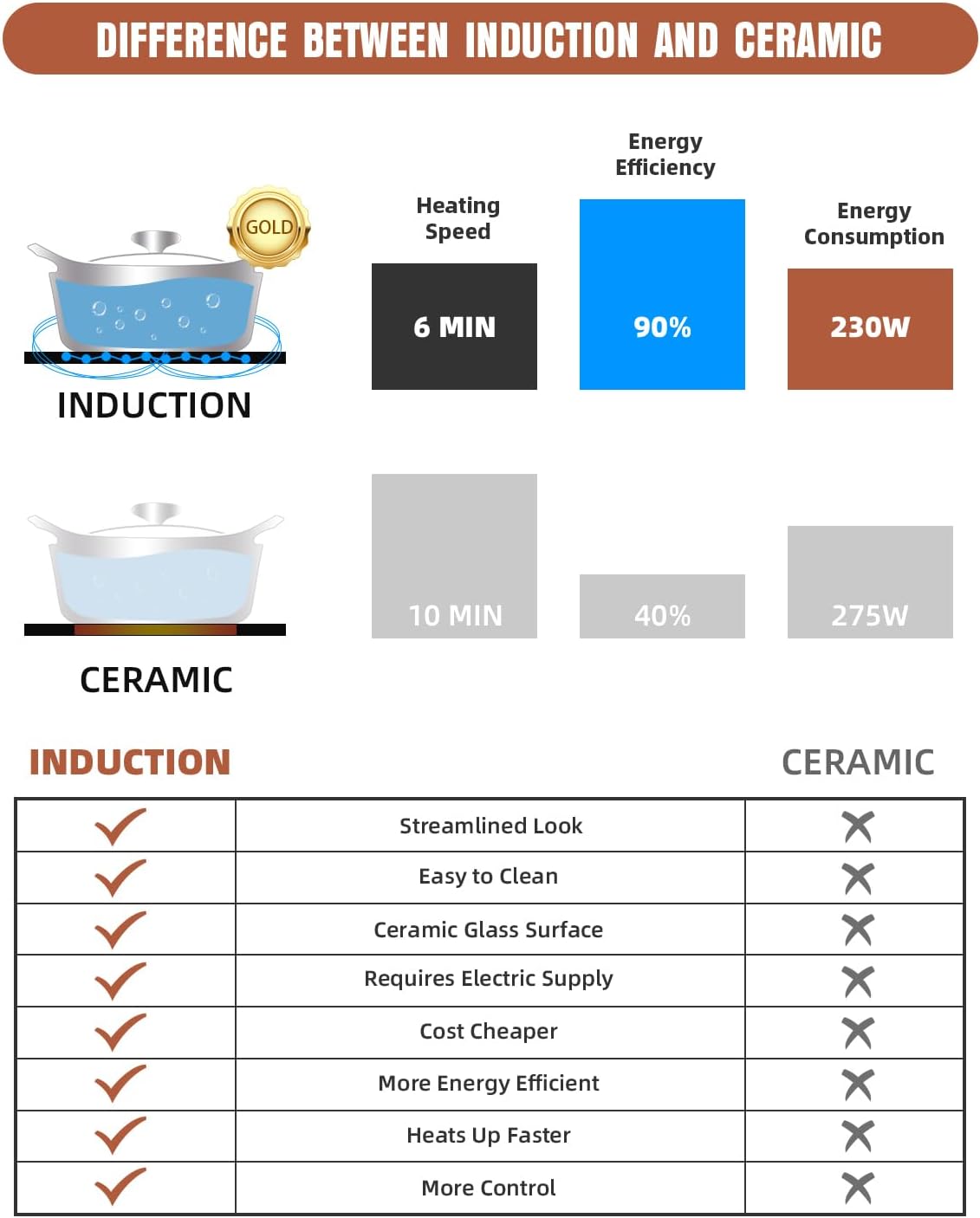 - 9 Temperature level settings (120°F to 460°F) , 8 Power Level settings from 300W to 1800W on Left Burner, 6 Power Level settings from 300W to 1300W on Right Burner power sharing. It has a heating level from as low as 300w to fast boiling, accurate and easy temperature changes at the touch of a button, boil, stew, fry, stir fry, switch from one mode to another as needed, making cooking easy and enjoyable.