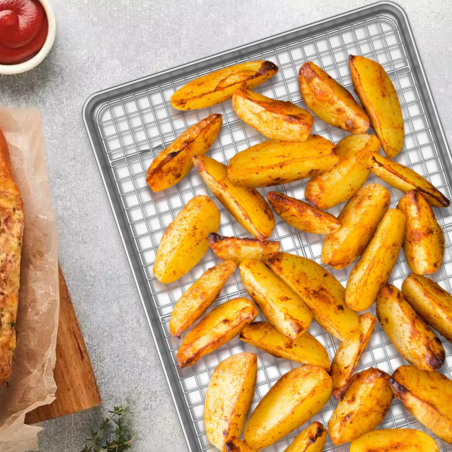 - PRODUCT INCLUDES: Including 2 baking sheet 40.7 X 30.8 cm (16.02 x 12.13”), 2 cooling rack 38.7 X 28.5cm (15.24 x 11.22’’), perfect to be used as cookie sheet or baking sheet for your regular oven and toaster oven