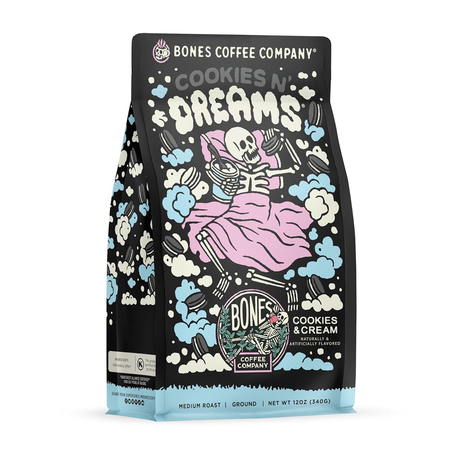 Bones Coffee Company Cookies 'N Dreams Cookies and Cream Flavored Coffee, Medium Roast Low Acid Arabica Beans Compatible with Auto drip and French Press Coffee Maker, 12 Oz Ground