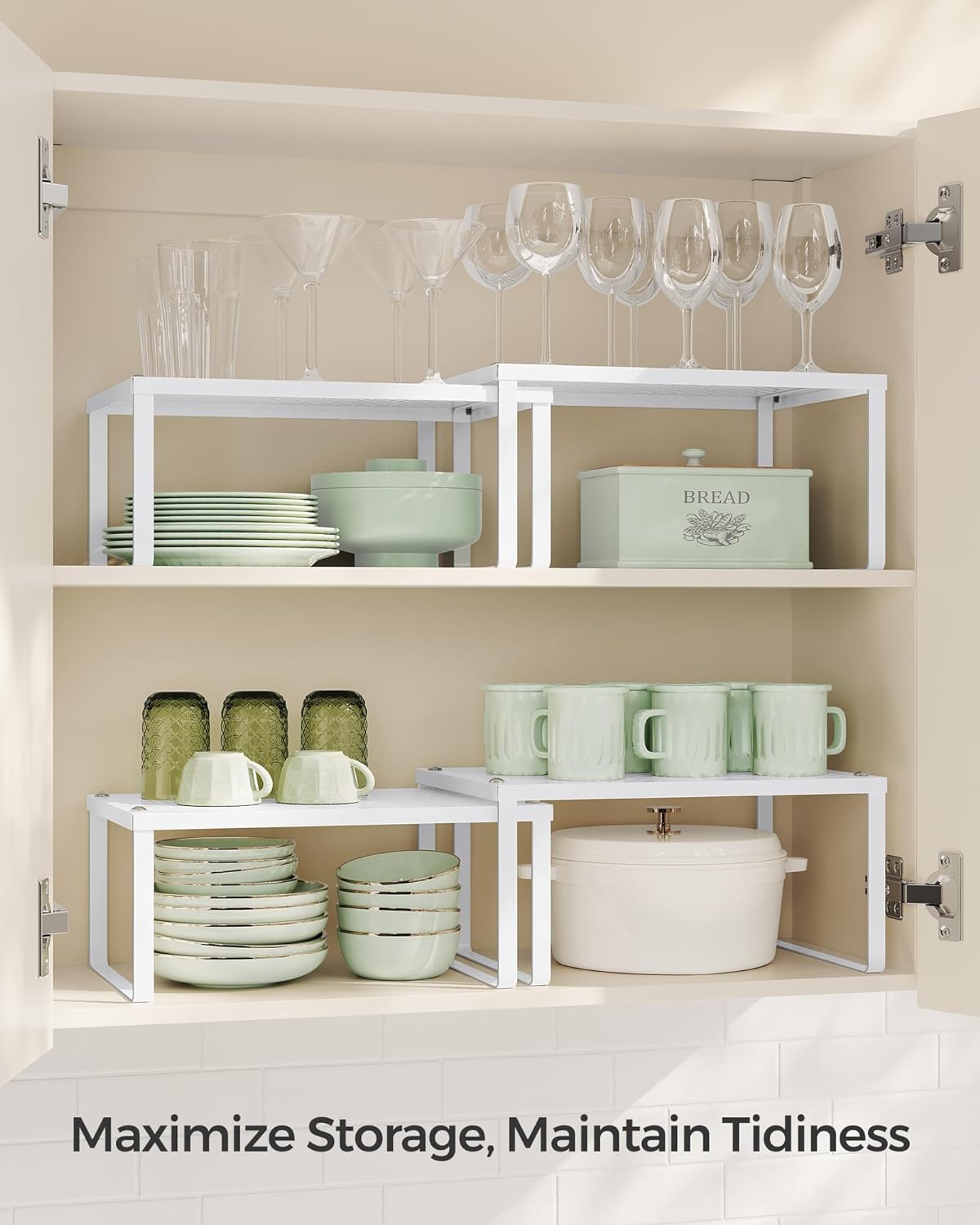 SONGMICS Spice Racks, Set of 4 Metal Cabinet Shelf Organizers, Countertop Organizers, Shelf Risers, Stackable, Expandable, White UKCS006W01