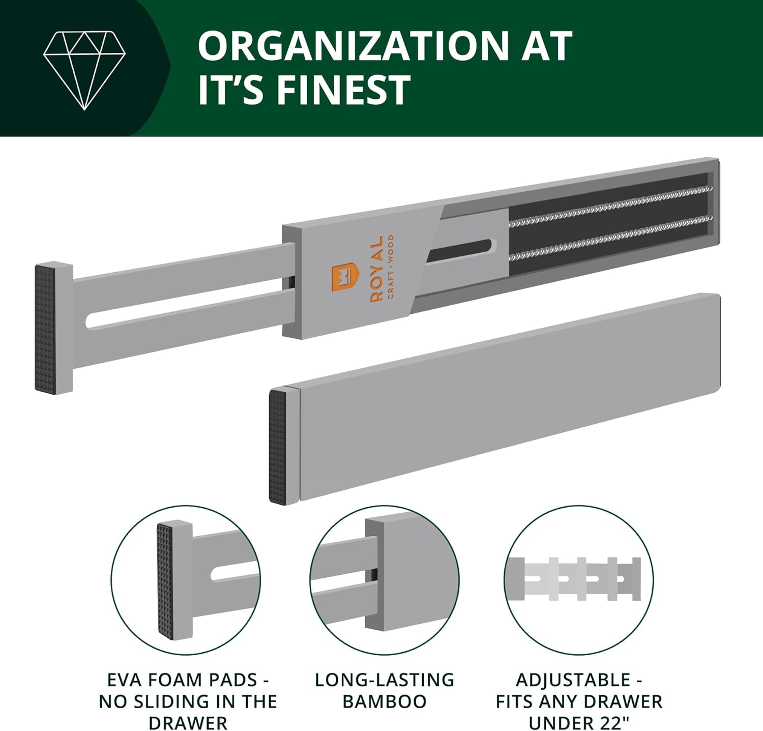 - 💎 ULTIMATE STORAGE SOLUTION FOR ANY DRAWER: Royal Craft Wood has created the perfect economical solution to help organize and sort both small and large accessories. Built of premium bamboo materials, these are the only drawer section sorters you will ever need, made to last for years! Built-in EVA foam padding on either end keeps each piece securely in place, ensuring your items don’t get mixed together from constant use, while also preventing damage from scratches on the original drawer