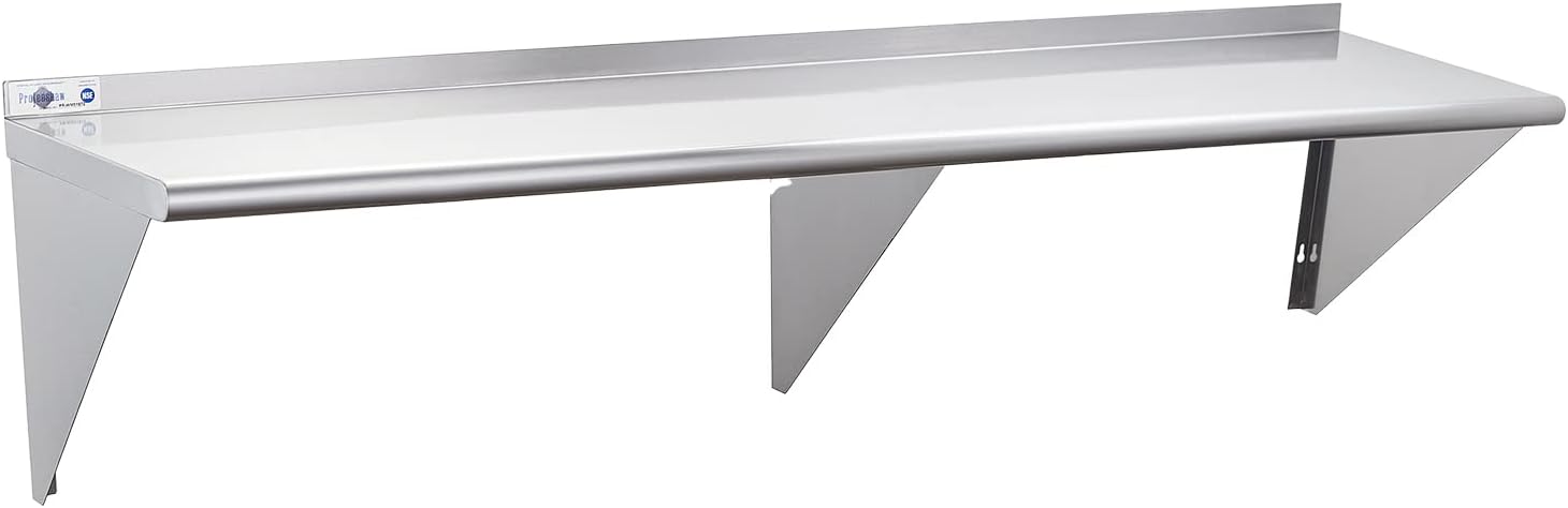 - Premium Stainless Steel: Made of 18 gauge Type 430 stainless steel, this wall mounted shelf is NSF certified to meet stringent public health standards and regulations. It is resistant to corrosion and rust, beautiful and practical, and durable. The food-grade stainless steel surface, is flat and smooth, which is easy to clean and sterilize