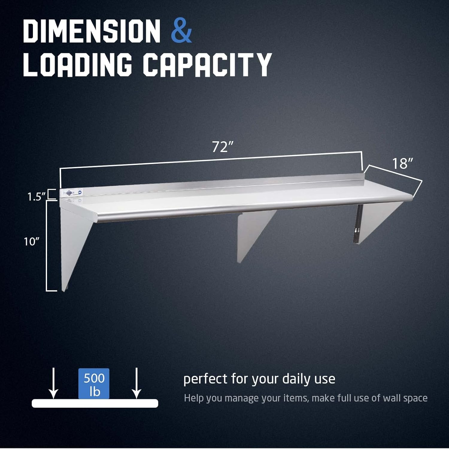 - Strong Bearing Capacity: It has excellent bearing capacity. The 72 inch metal wall mounted shelf can bear 500 lb and can be used to place condiments, kitchen supplies, including microwave ovens, ovens, rice cookers and other heavy objects. The size is 18 "W x 72" L. It adds extra storage space to help you arrange your kitchen space and keep it tidy
