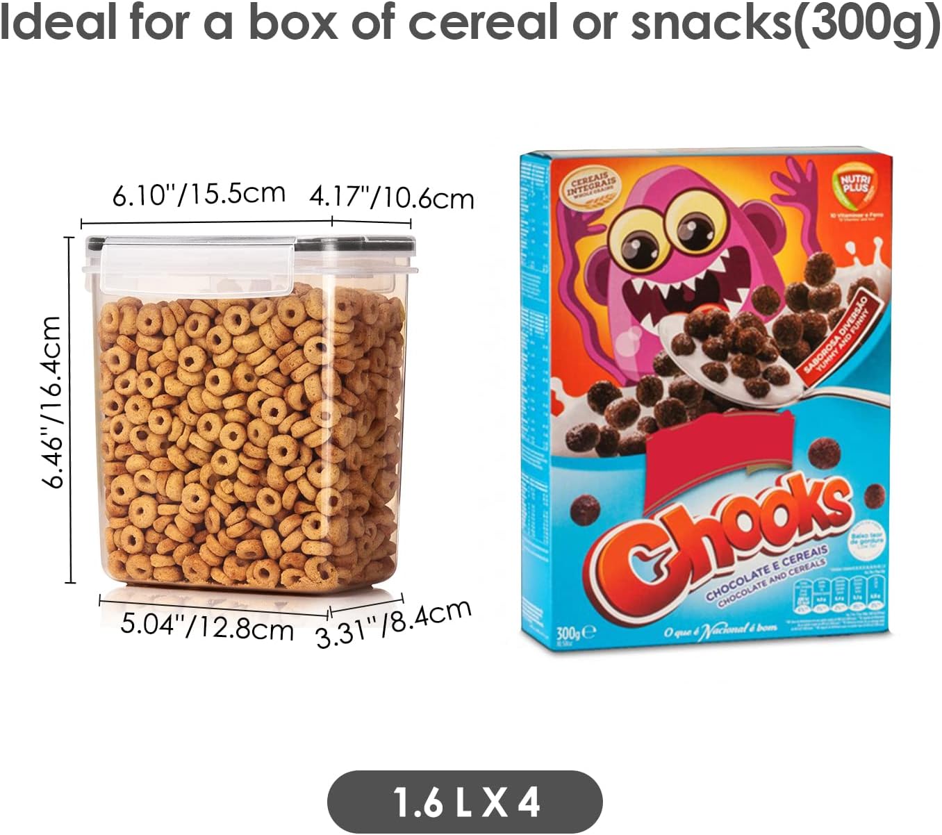 - Perfect for Different Storage----Our kitchen storage containers set comes in two different sizes. 2 large containers are 3.3 quart (3.6 liters), which is the ideal size for a 5 lb bag of flour and sugar. Other 4 small containers are 1.5 quart (1.6 liters ), they are perfect for storing a small box of cereal (300g). You also can use them to store baking supplies,oats, pasta, rice, coffee, tea, snacks, nuts.