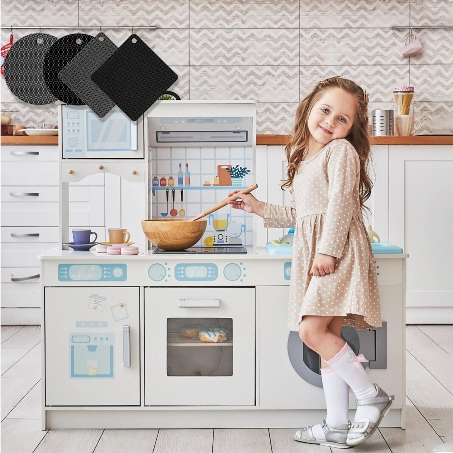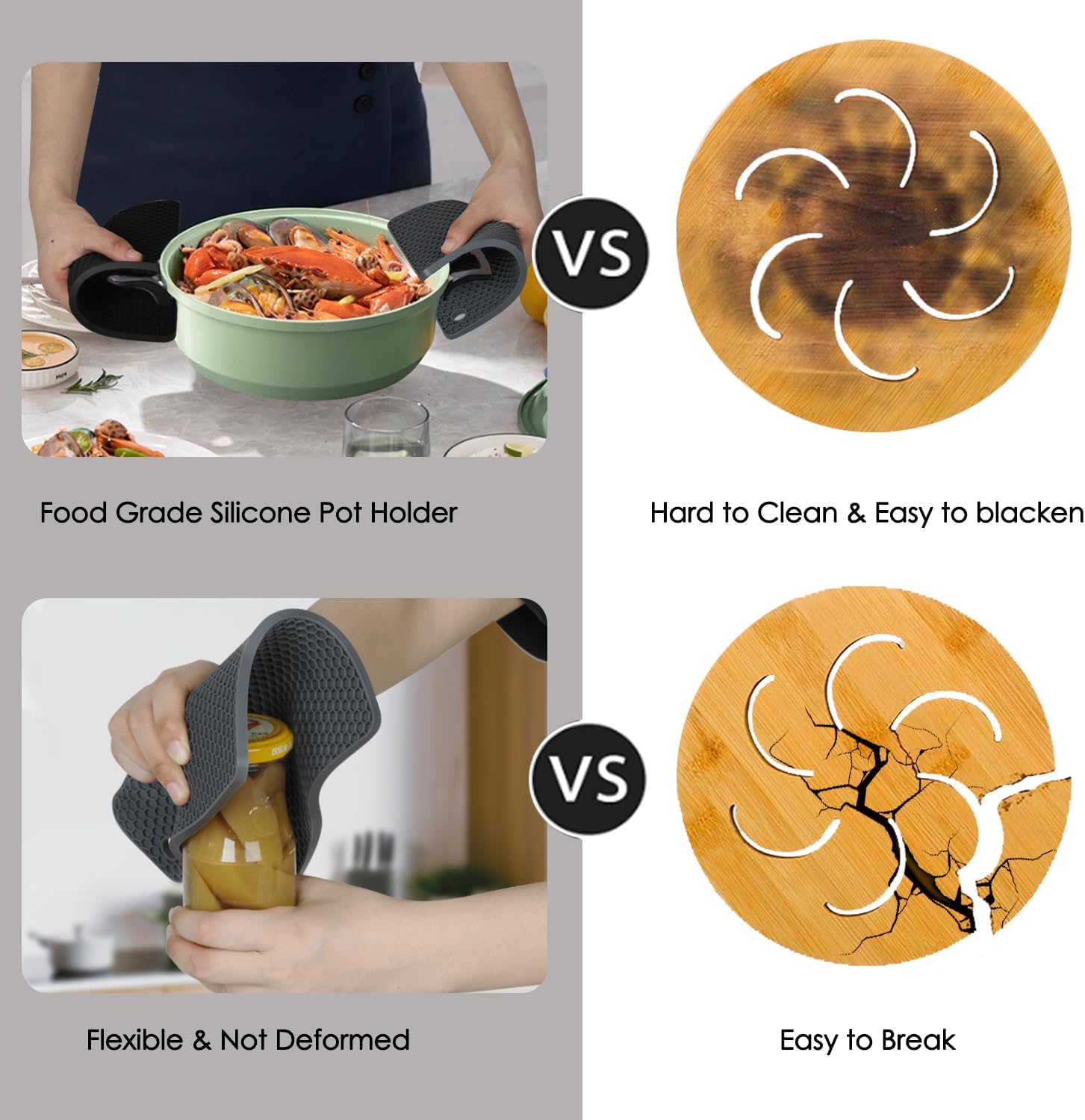 - đăFLEXIBLE & DURABLEă- Our 4 pack silicone hot pads are very flexible, great to grab, a tensile property is good and the service life is long. Honeycomb-designed kitchen hot pads take over the water and with great texture prevent water droplets from the counter and are anti-slip and also easy to dry by squeezing out or shaking. Easy to clean, safety wash in the dishwasher, each mat with a hole for easy hanging.