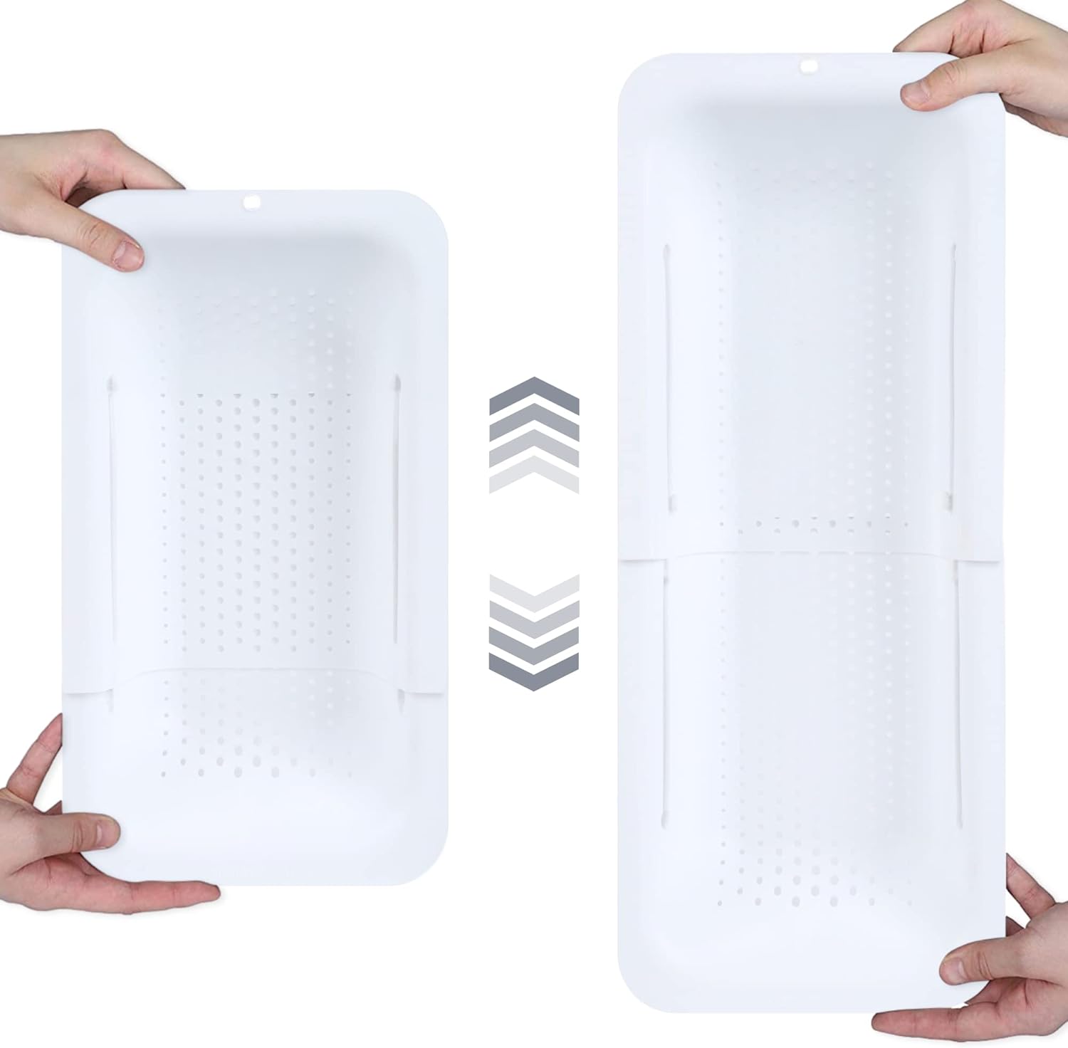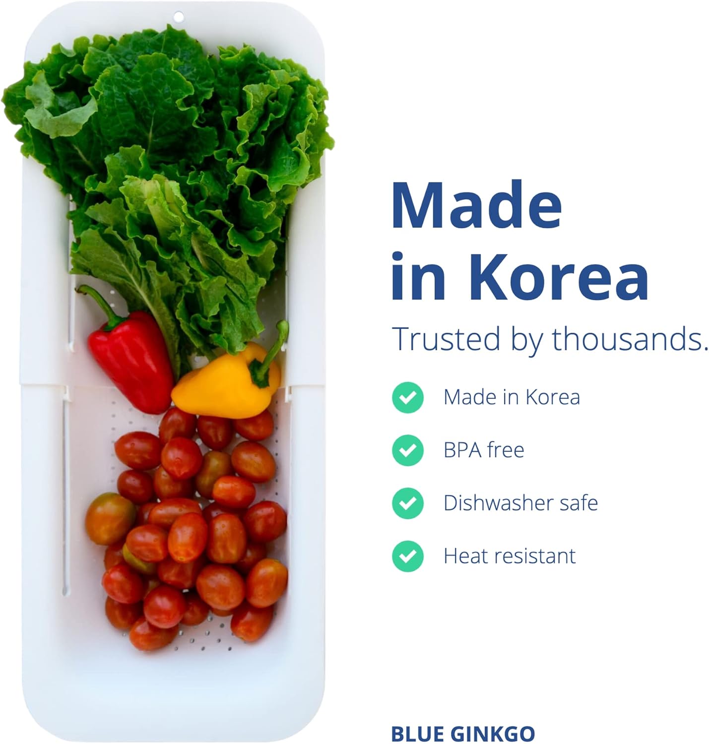 BLUE GINKGO Over the Sink Colander Strainer Basket - Wash Vegetables and Fruits, Drain Cooked Pasta and Dry Dishes - Extendable - New Home Kitchen Essentials (7.9 W x 14.5-19.5 L x 2.75 H) - White