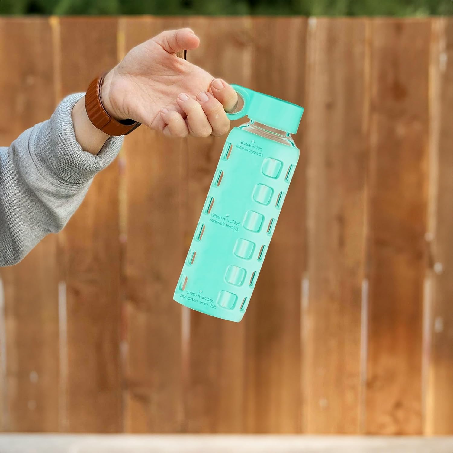 purifyou 40oz / 32oz / 22oz / 12oz Borosilicate Glass Water Bottle with Time & Volume Markers, Silicone Sleeve, Stainless Steel Lid – Reusable Glass Bottle for Water & Juice (12oz Glow-in-the-Dark)