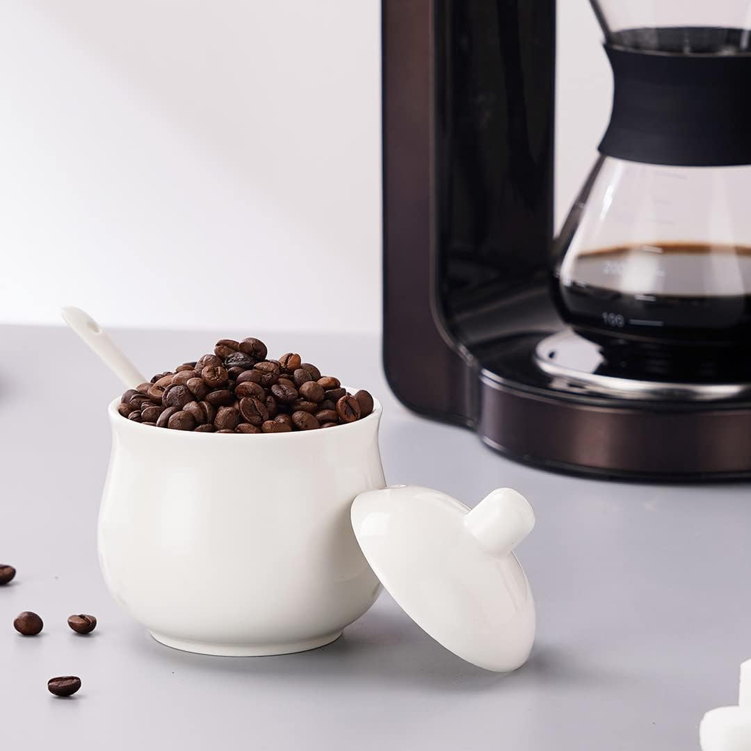 Ceramic Sugar Bowl with Lid and Spoon, White Porcelain Sugar Salt Pepper Storage Jar, 8 Ounces