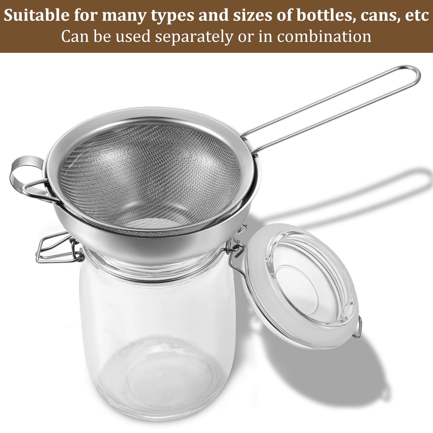 - Good solution for sifting and filling: our kitchen canning funnels and fine mesh strainers can be applied together or separately according to your needs, the funnel can accurately and quickly transport items into bottles and other containers; The strainer can be used to sift flour, filter impurities in fruit juice, milk, and separate food from water and oil