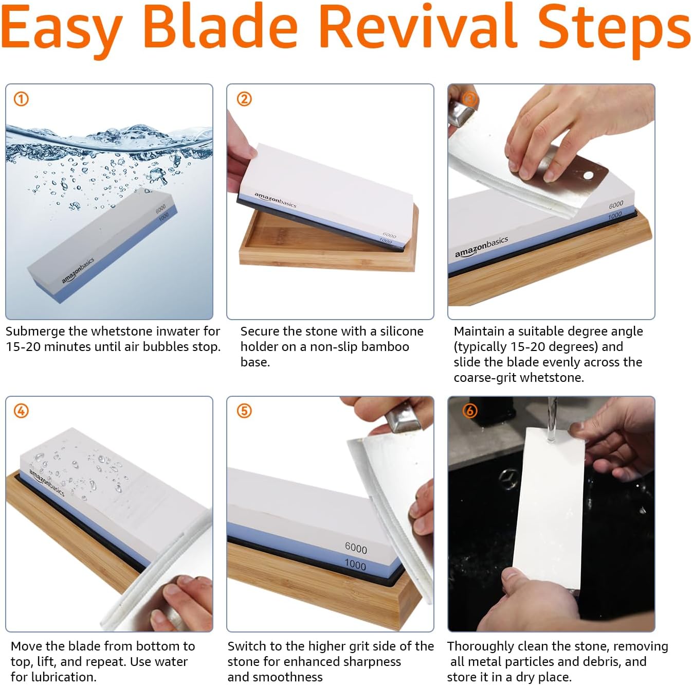 Amazon Basics Whetstone Knife Sharpening Wet Stone Dual Sided 1000/6000 Grit with Non-Slip 1 Pc, Bamboo Base, Black & Grey