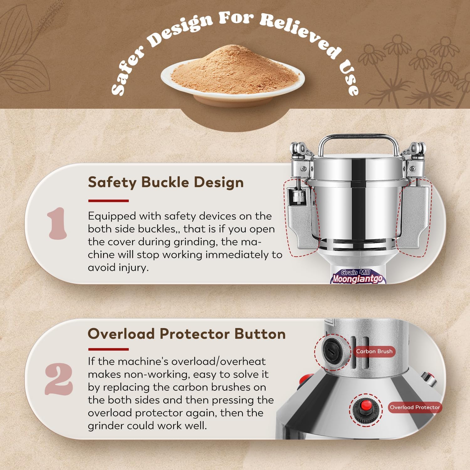 - SAFER DESIGN FOR RELIEVED USE - Our electric grinder is equipped with a safety buckle device on the both sides of lid, that is if you open the lid during grinding, the machine will stop working immediately to avoid injury. And with upgraded overload protector, the grinder will also stop working to prevent the motor from burning-out when in overload/overheat state.