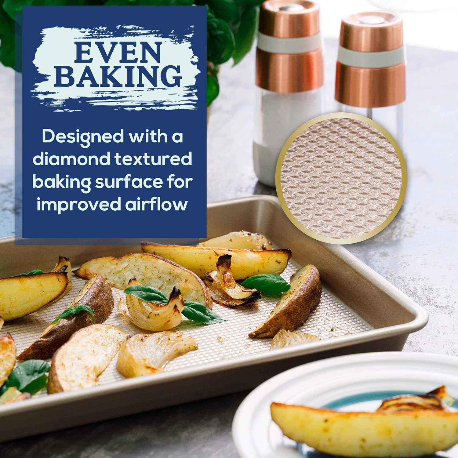 - ACHIEVE FLAWLESS BAKING RESULTS: The 10x15 jelly roll pan ensures even airflow distribution for perfectly baked cookies and proteins every time, thanks to its diamond textured surface. The exterior measures 14.8 x 10.0 x 1.1 inches and the interior 14.01 x 9.1 x 1.1 inches. This 10 inch pan guarantees superior baked goodies every time
