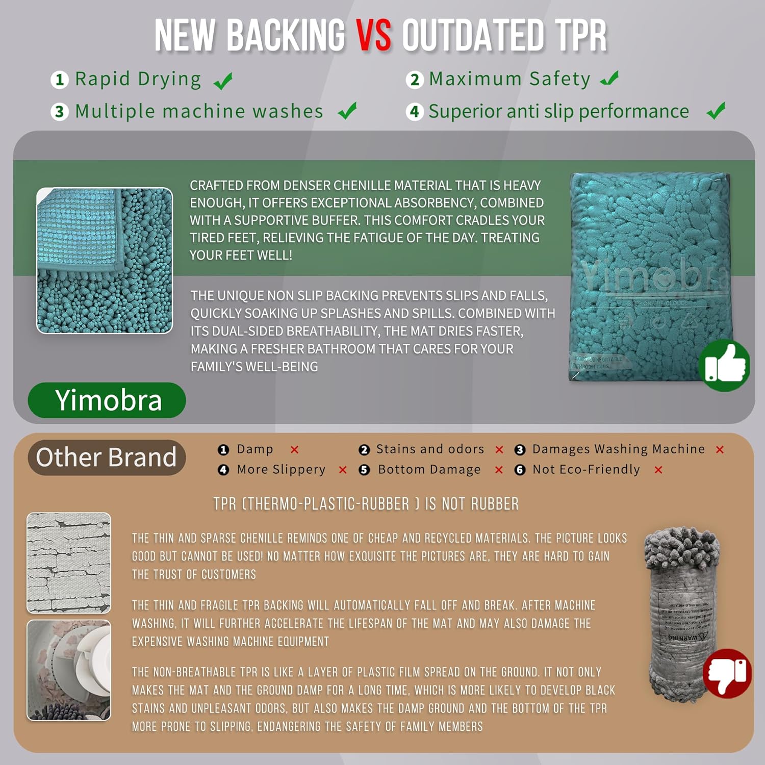 - Total Grip Safety & Quick Dry: Yimobra bath rug features a feather-light yet ultra-grippy hot-melt backing that stays firmly in place on wet surfaces. Its vertical air-channel chenille fibers ensure rapid and complete dryness, providing instant dry safety the moment you step out of the shower. The product is tested for harmful substances, performance, longevity, and emissions in accordance with the OEKO-TEX Standard 100