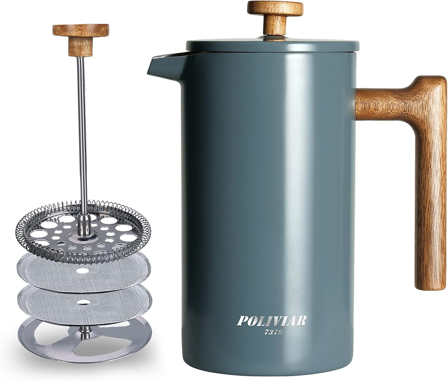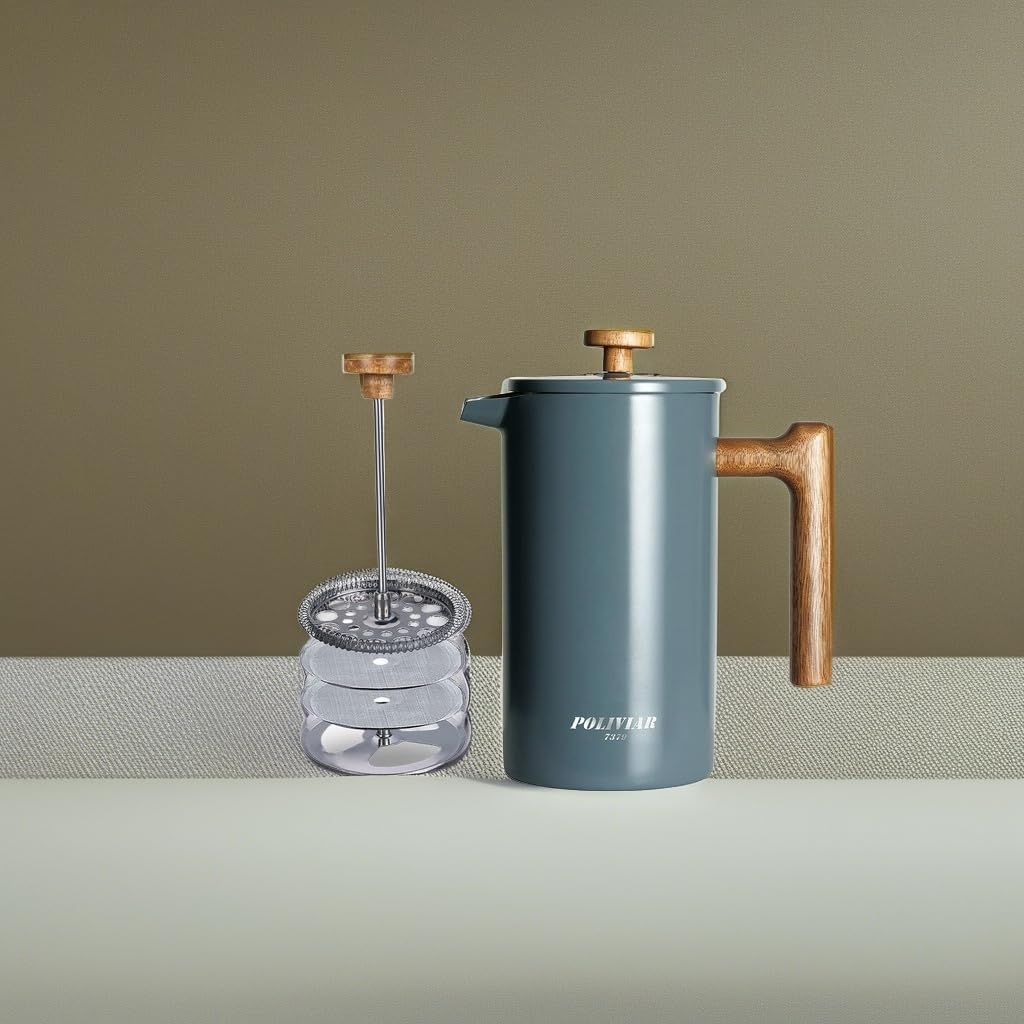 - LOOKING FOR COFFEE PRESS FOR MATCHING UP YOUR KITCHEN? We, the POLIVIAR french press coffee maker will be your smart choice. While the coffee pot is made from food grade stainless steel with stylish long-lasting coating, It is easily to match up your kitchenwares and your kitchen's theme. Also, the ergonomic handle with real wood will maximize the fantastic time of grounds you loved.