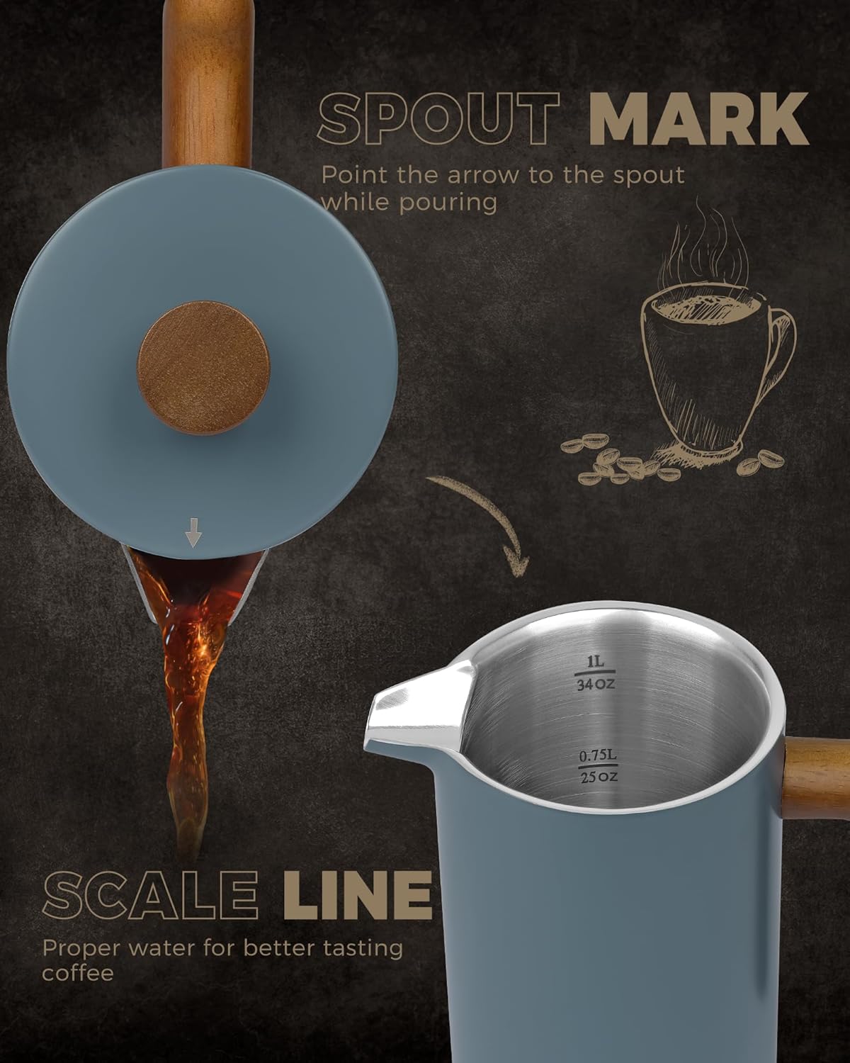 POLIVIAR French Press Coffee Maker, 34 oz Coffee Press with Real Wood Handle, Double Wall Insulation & Dual-Filter Screen, Food Grade Stainless Steel for Good Coffee and Tea (Alpline)
