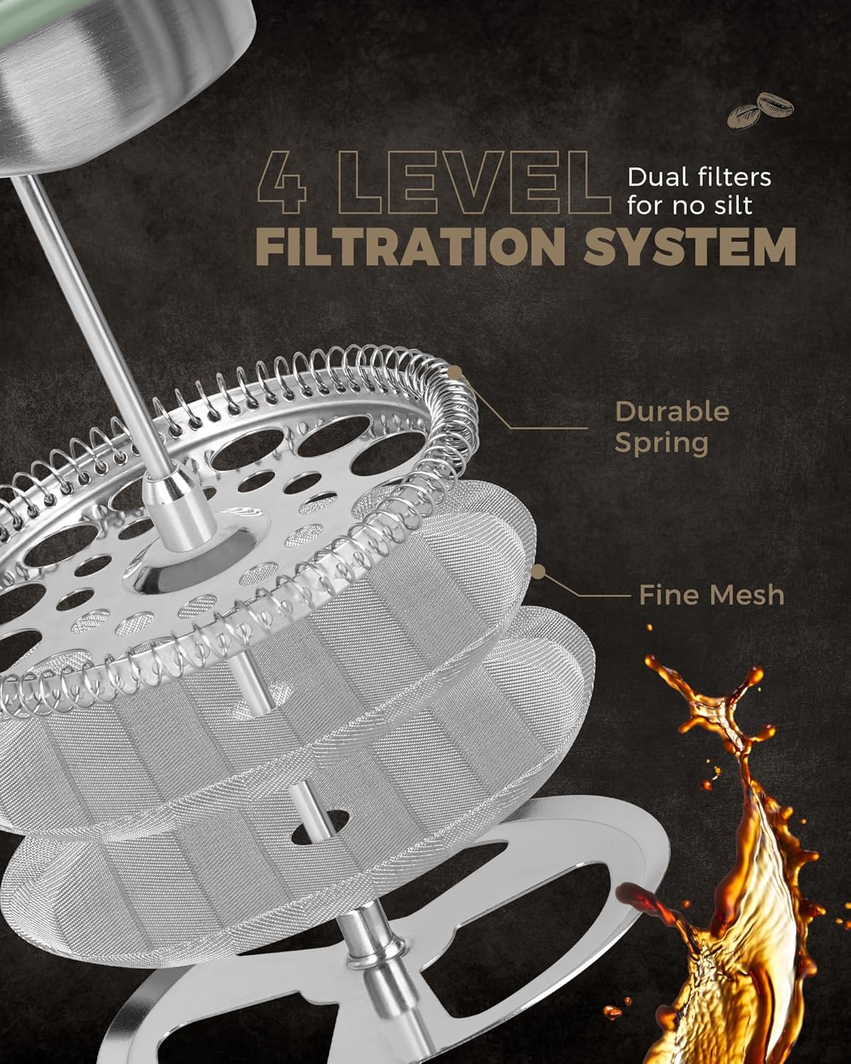 - A GOOD COFFEE PERCOLATOR WILL FILTER OUT THE SEDIMENT BUT NOT THE TASTE AND AROMATIC COFFEE OILS.This press maker is designed with dual-filter screen and composed of a sandwich of steel mesh held in place to increase the smoothness of the brew and keep the orginal taste of grounds.