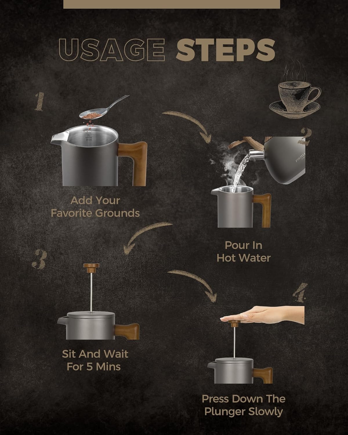 - LOOKING FOR COFFEE PRESS FOR MATCHING UP YOUR KITCHEN? We, the POLIVIAR french press coffee maker will be your smart choice. While the coffee pot is made from food grade stainless steel with stylish long-lasting coating, It is easily to match up your kitchenwares and your kitchen's theme. Also, the ergonomic handle with real wood will maximize the fantastic time of grounds you loved.