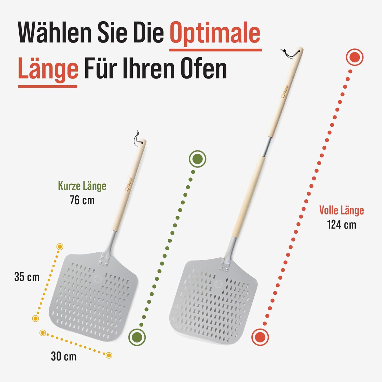 - TWO ADJUSTABLE LENGTHS: The Chef Pomodoro pizza peel handle extends from two pieces to one. So you can adjust your reach and extend up to 49” (more than 4 feet!). Or go in closer for smaller or lower temperature ovens.