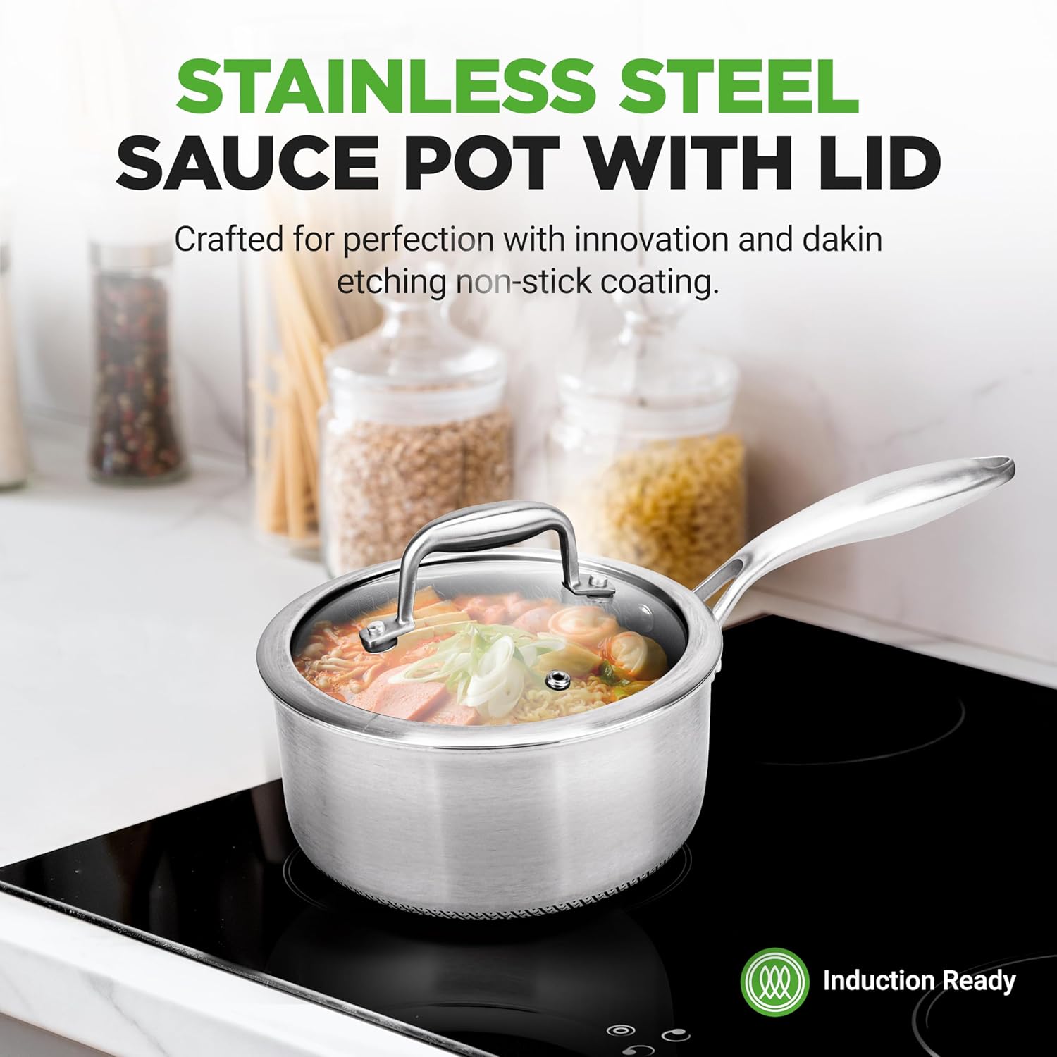 - INDUCTION READY: This professional stainless nonstick pot comes with see-through tempered glass lids with strong stainless steel rim to seal in heat and moisture. Safe for gas, electric, ceramic & induction counter cooktops