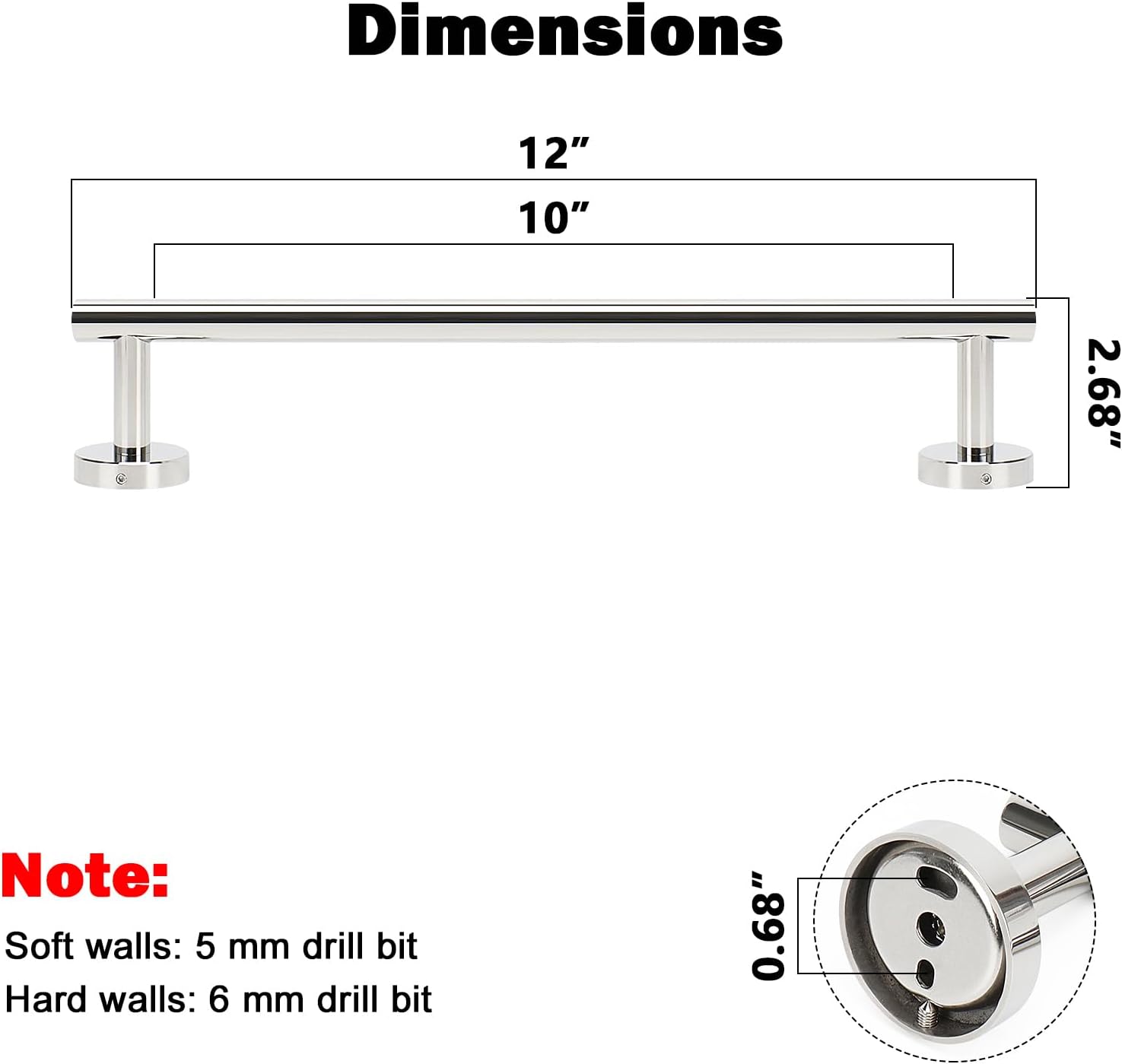 - DIMENSIONS & USE: Overall length is 12" (304mm). The length of hanging space is10" (250mm). 22-Lbs (10kgs) max weight capacity. You can mount this towel bar to either side of your cabinet or closet door for storing at-use hand and dish towels. It can also be used with S hooks, hanging bath balls, hair dryers, tea cups, spoons, clips, etc.