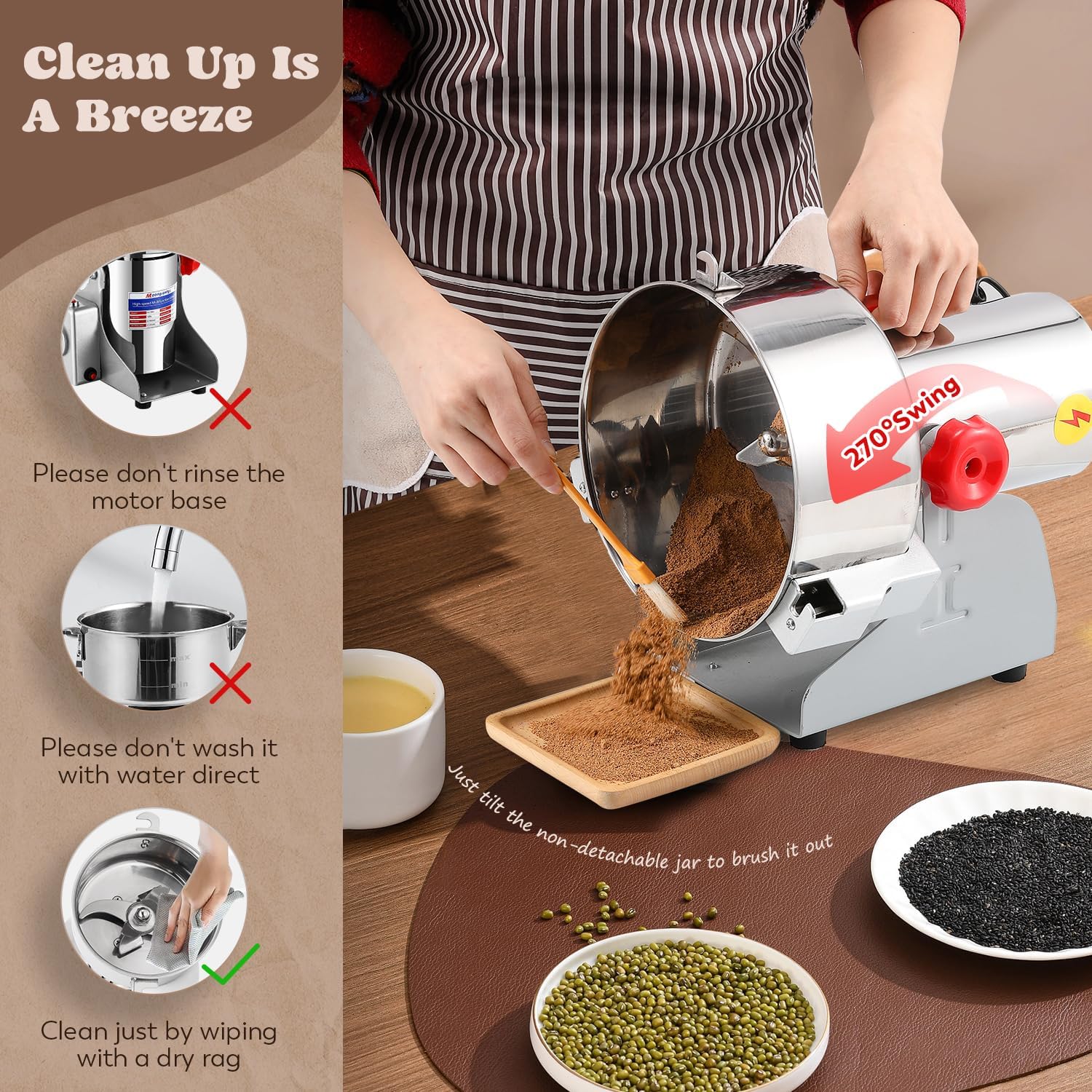- Easy To Use & Clean - This home mill grinder is easy to control by a 0-5 min Timer Switch. Turn the timer switch to the grinding time you want and the mill will start grinding automatically, and you can turn it back to zero to stop the operation immediately. Easily clean the inside jar with a cleaning brush and then wipe it with a dry cloth. (The grinding jar is not detachable, so Don't wash it with water directly or rinse the motor base.)