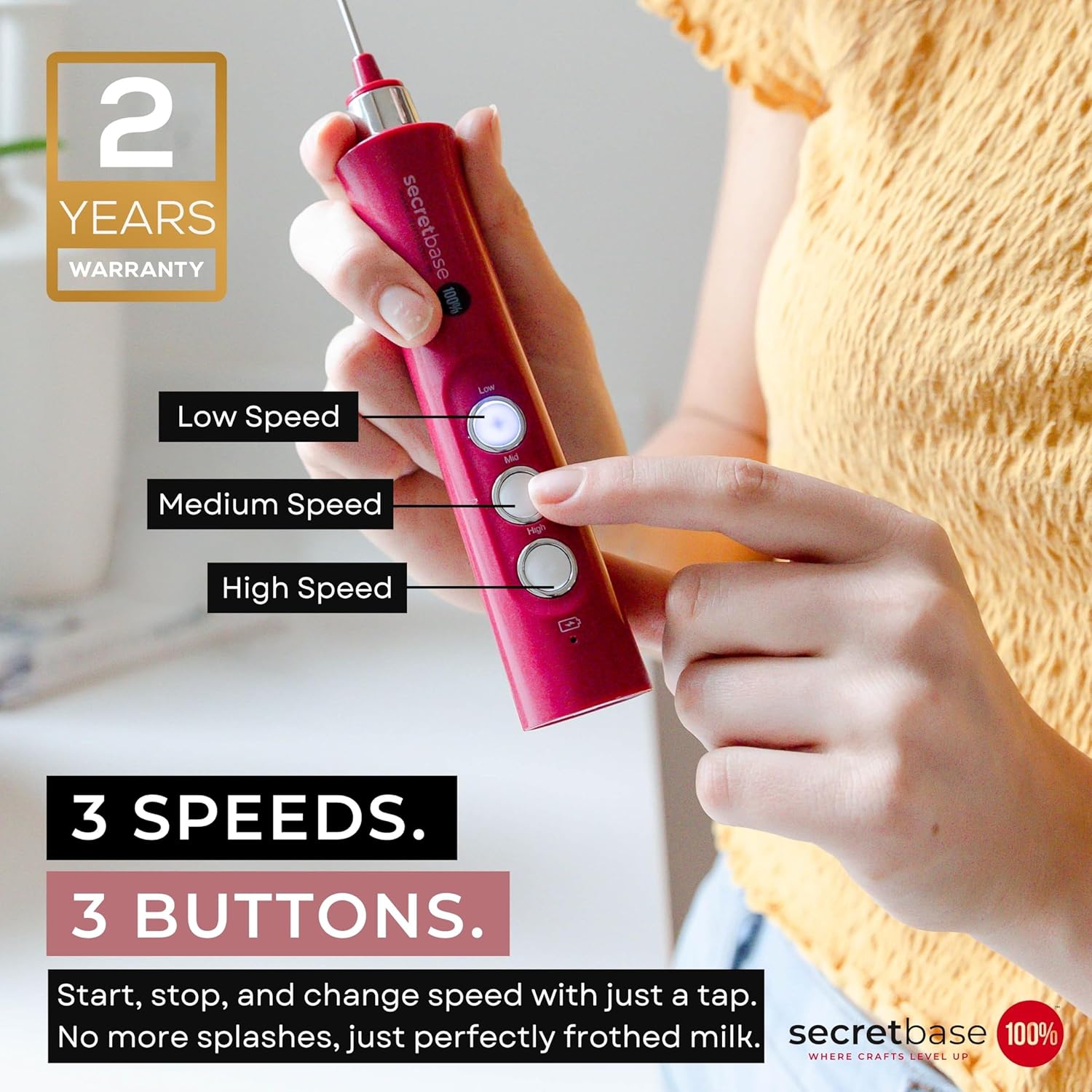 - Rechargeable Frother: Forget AA battery operated coffee stirrers that stop working after 2-3 months. Our rechargeable frother saves hassle and the cost of batteries! Plug it into your wall charger, or computer level up your morning coffee anywhere, with SecretBase 100%.