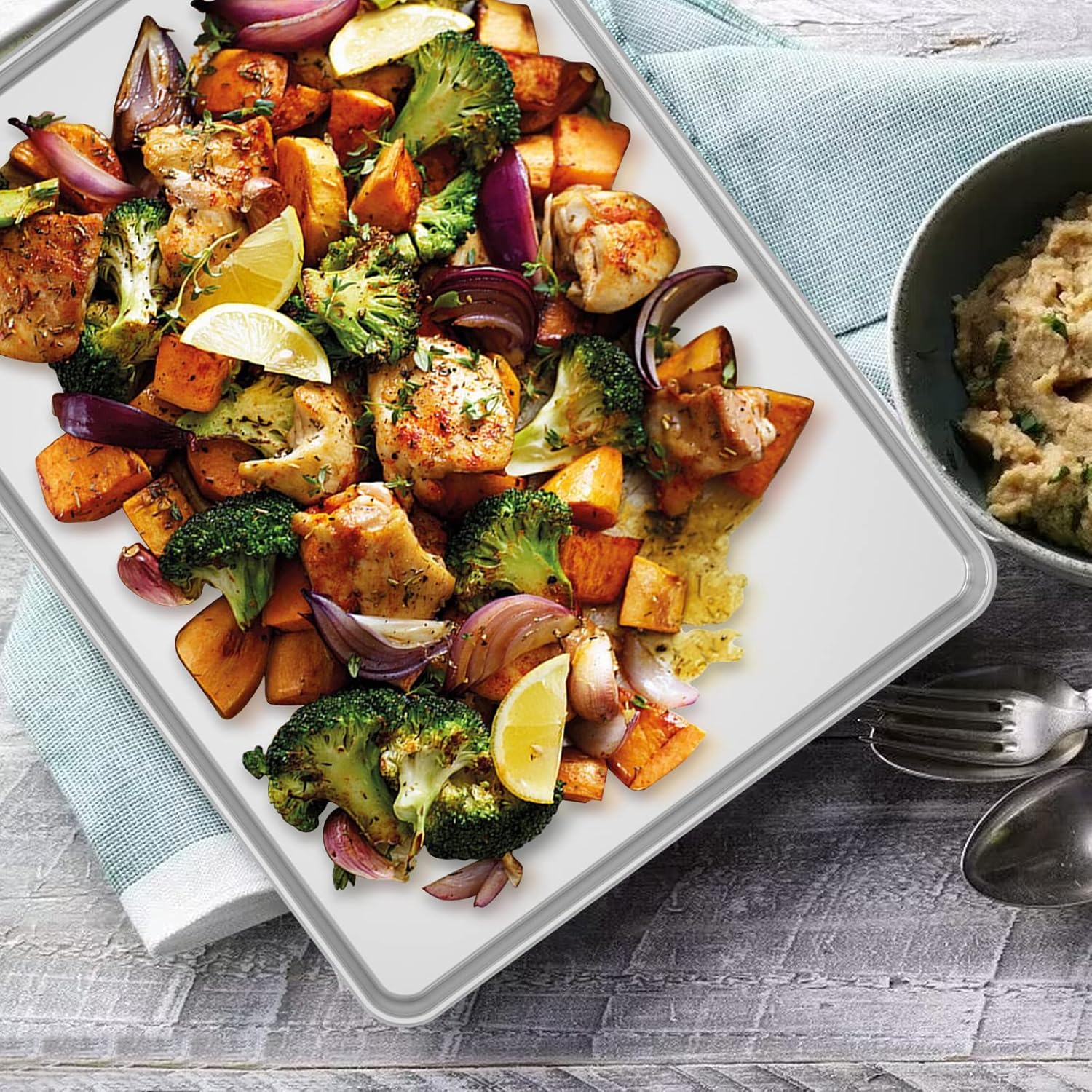 - PREMIUM MATERIAL: No more aluminum into your food, great replacement to aluminum pan. The baking sheet pan is made of high quality stainless steel without chemical coating or any other materials.