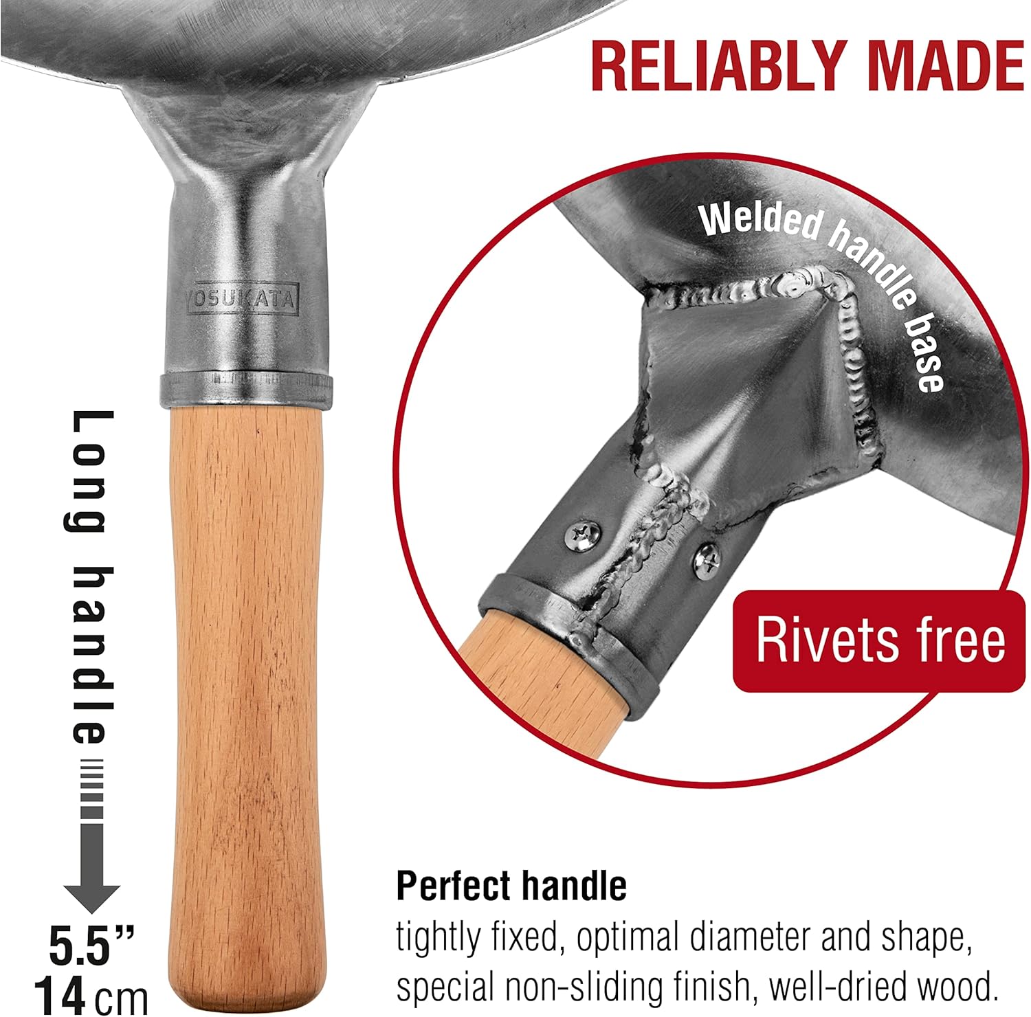 - HAMMERED & READY TO SEASON: This hand-hammered carbon steel wok is crafted by skilled artisans for perfect shape and heat distribution. Built to last, its handle base is securely welded—no screws, no wobble. The wok arrives unseasoned and requires initial high-heat pre-seasoning by the user. After heating, season with oil to develop a natural, non-toxic non-stick alternative surface that improves with every use.
