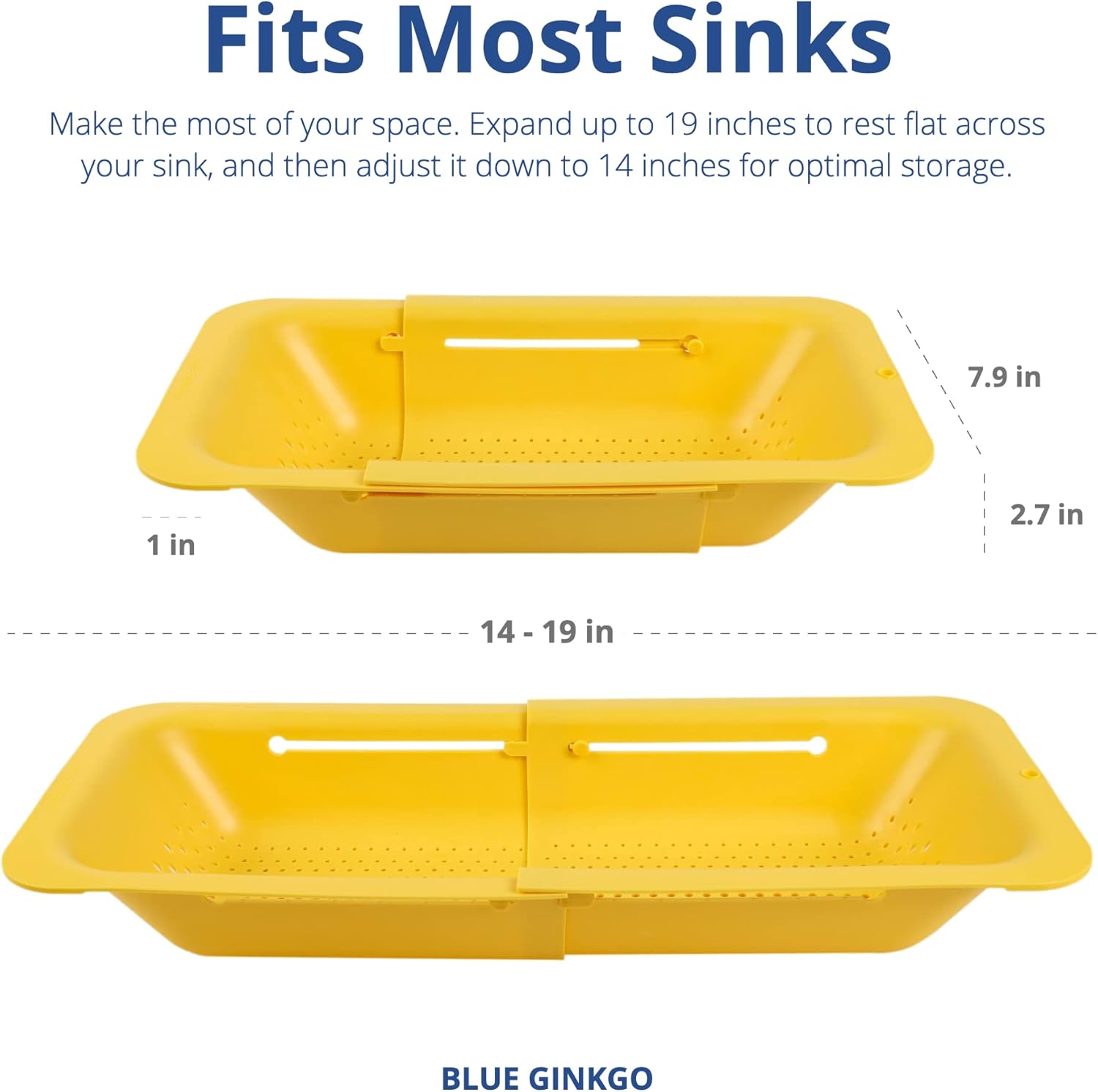BLUE GINKGO Over the Sink Colander Strainer Basket - Wash Vegetables and Fruits, Drain Cooked Pasta and Dry Dishes - Extendable - New Home Kitchen Essentials (7.9 W x 14.5-19.5 L x 2.75 H) - Yellow