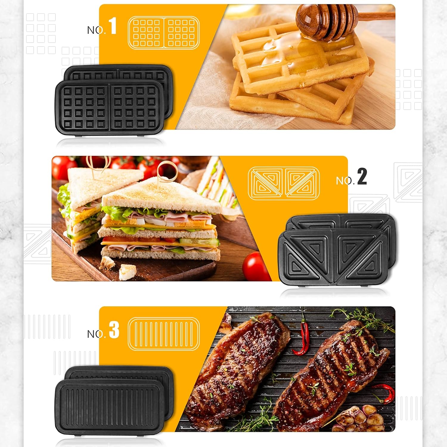 - 3-IN-1 MULTI-FUNCTION BAKING PLATE - there are three sets of plates that can be switched at will. The sandwich pan can be used to make sandwiches and heat bread slices; the waffle pan can be used to make waffle desserts, and the baking pan can grill steak, pork chops and corn, Potatoes, tomatoes, vegetables, etc., can also be used to press panini.