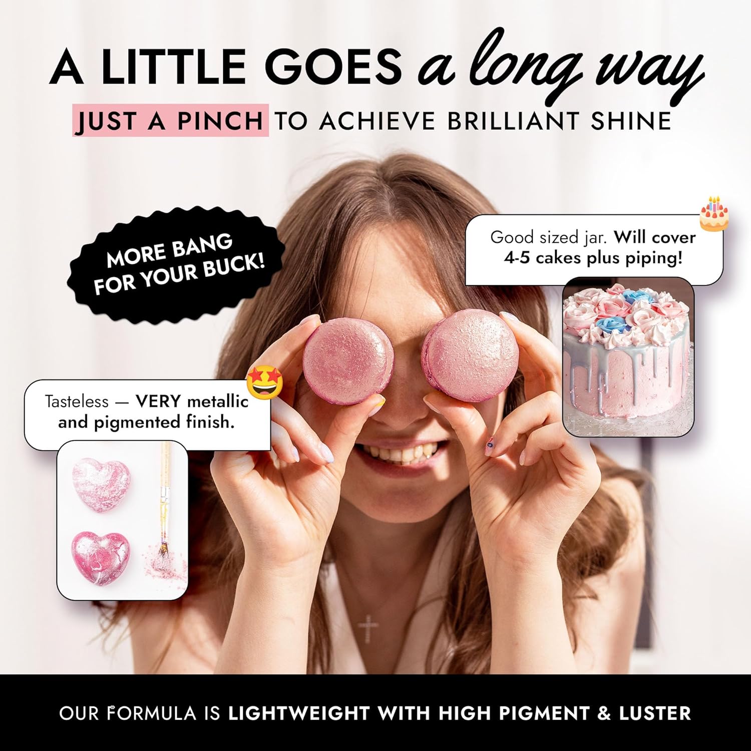 - EASY TO USE: Our pink luster dust is incredibly versatile. Apply with a wet brush, airbrush, or dry brush, and even mix into beverages. Achieve professional-looking results effortlessly at home, whether decorating halloween cakes or adding shimmer to cocktails.