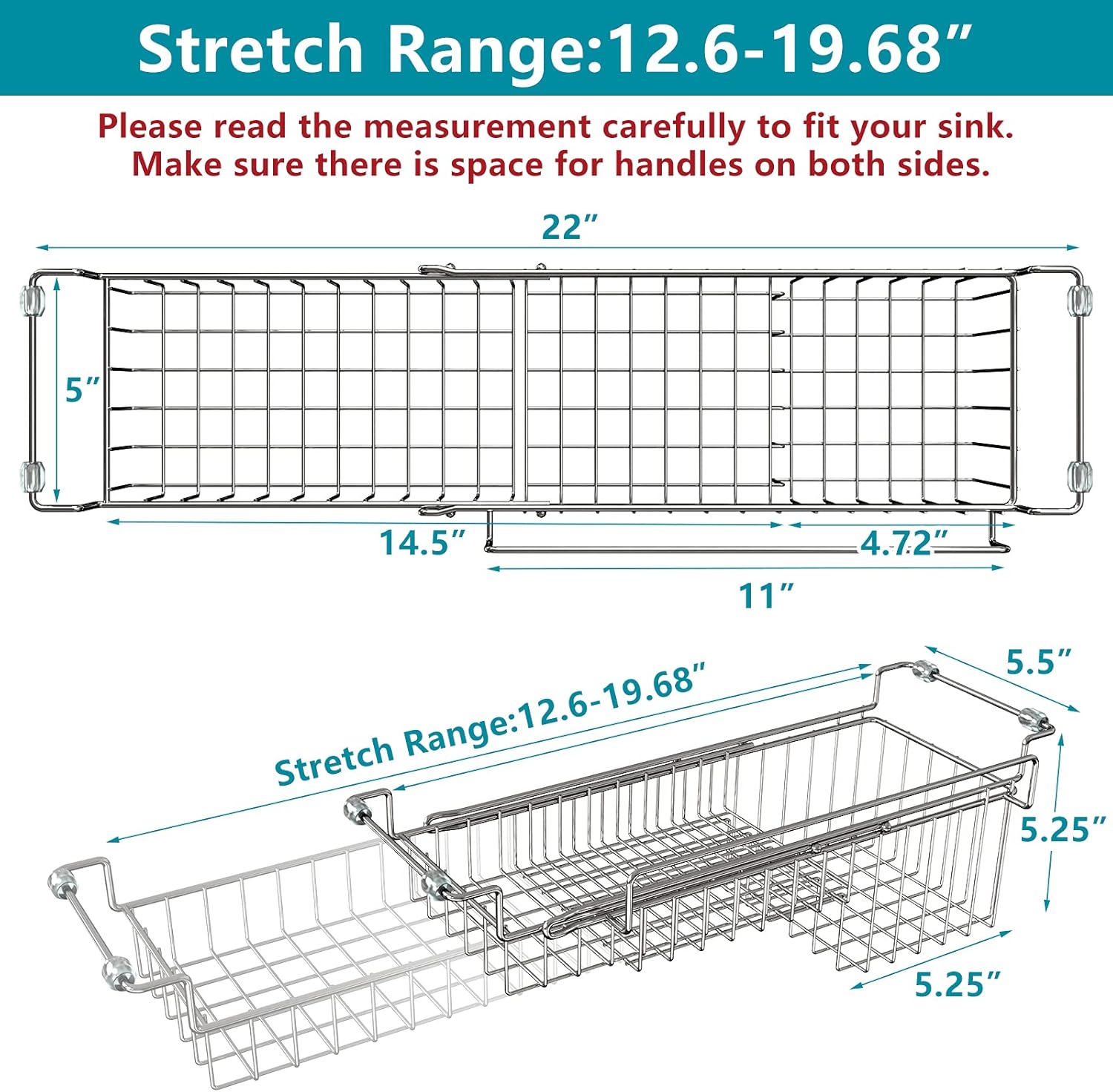 - POWERFUL EXPANDABLE DESIGN - The innovative kitchen sink organizer expands from 14.5" to 22" wide, increasing the available storage space and is more flexible than other over the sink caddy. Fit well to your sink which is 14 to 21 inches length or width.