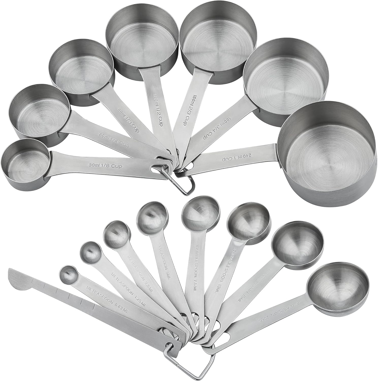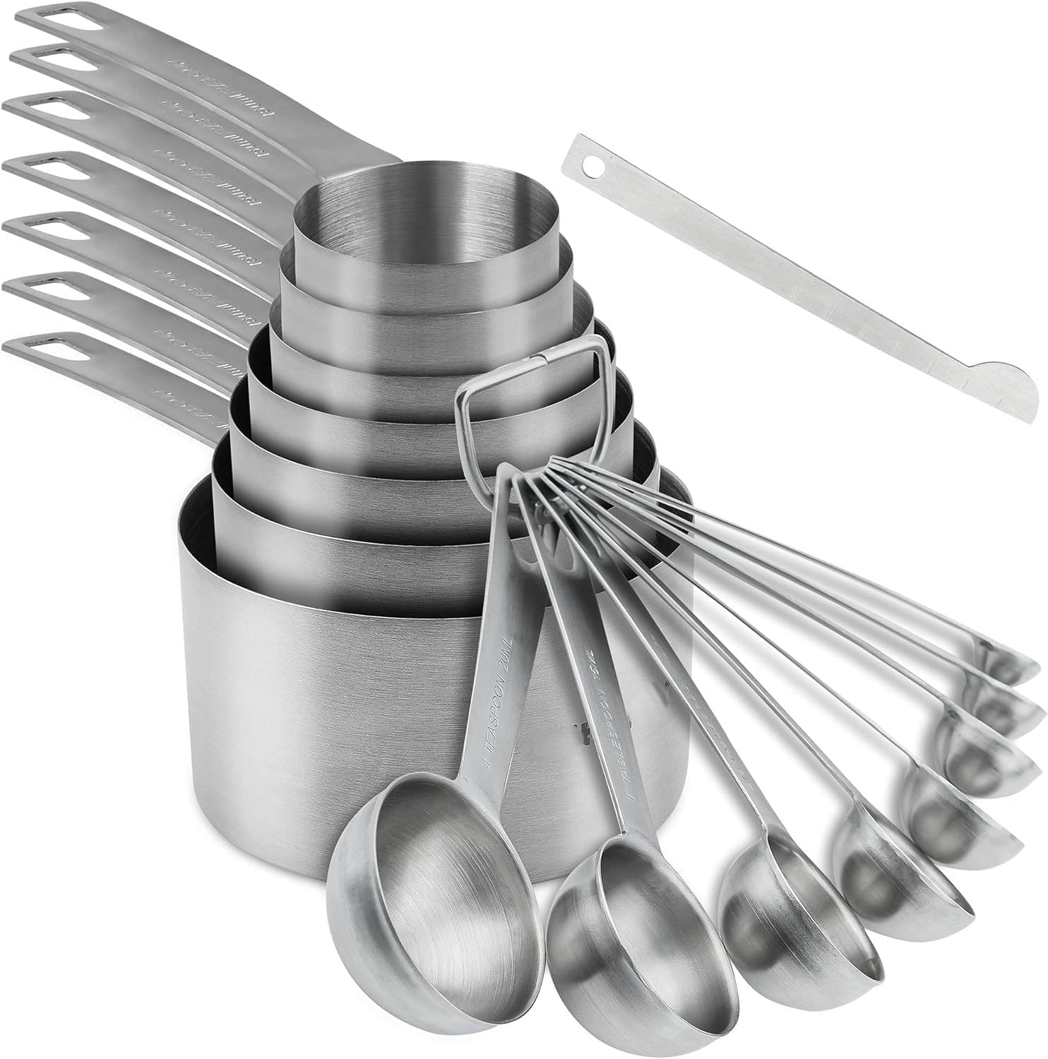 Measuring Cups and Spoons Set, Stainless Steel Measuring Cups, 18/8(304) Material Heavy Duty 7 Measuring cups and 8 Measuring Spoons 1 Leveler and 2 rings Pack 18pcs Per set