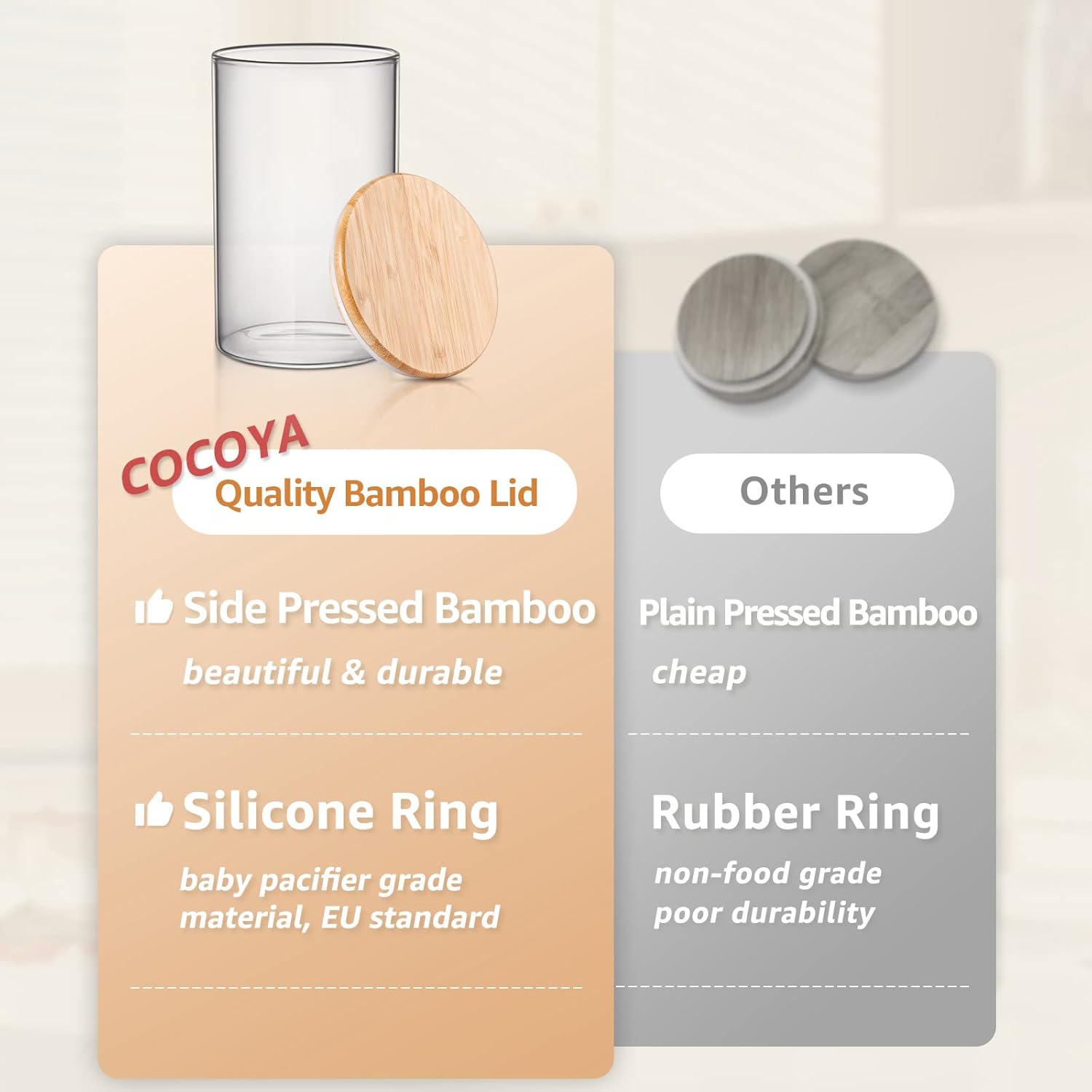 - 【Better Lids】 Made of selected bamboo, more durable and beautiful, with high-quality silicone ring, closed tightly, ants are kept away and your foods are safely stored.