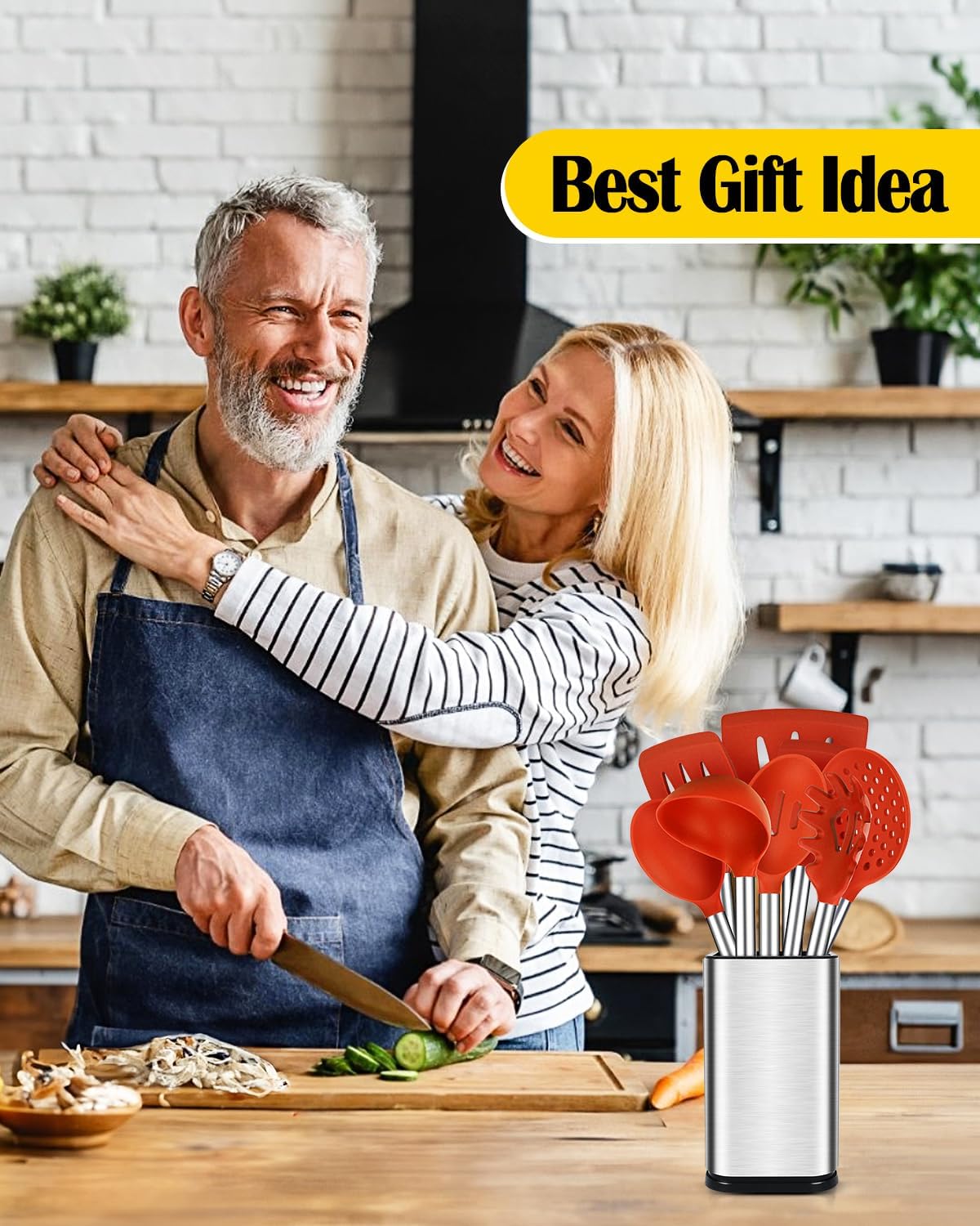 Silicone Cooking Utensil Set, 8Pcs Non-stick Cookware with Stainless Steel Handle, BPA Free Heat Resistant Kitchen Tools with Spatulas, Turners, Spoons, Skimmer and Pasta Fork (RED)