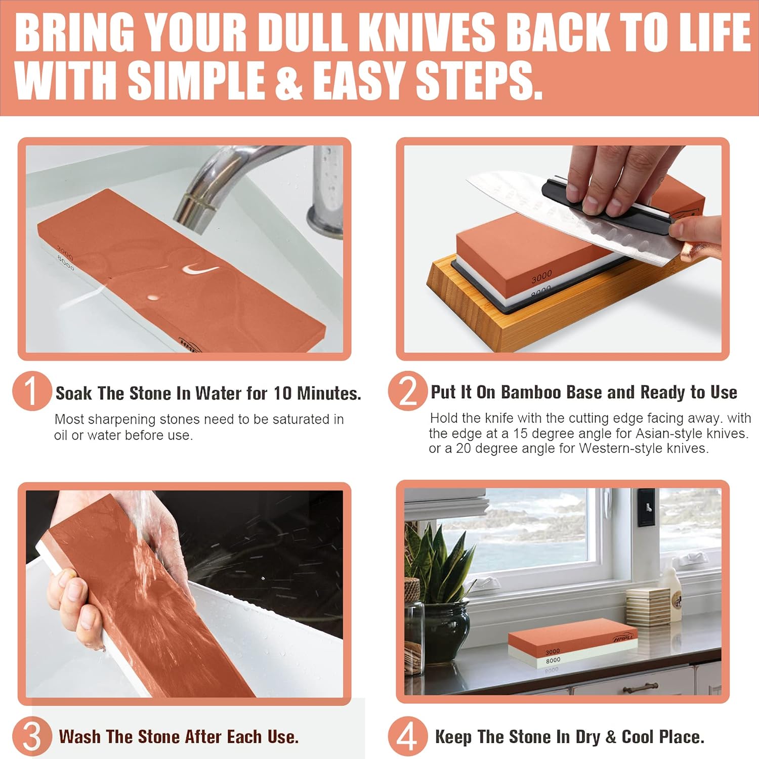 - Easy To Use: Whetstone knife sharpener are lubricated with water, no expensive grinding oil needed. Before using whetstone, you need to soak the stone 10-15 minutes and they are ready to use. The sharpening stone is not to cracked. When you sharpen your knife, you can add water on it, water the lubricating effect of grinding results will be better and will help you save time and increase the sharpness of the blade.