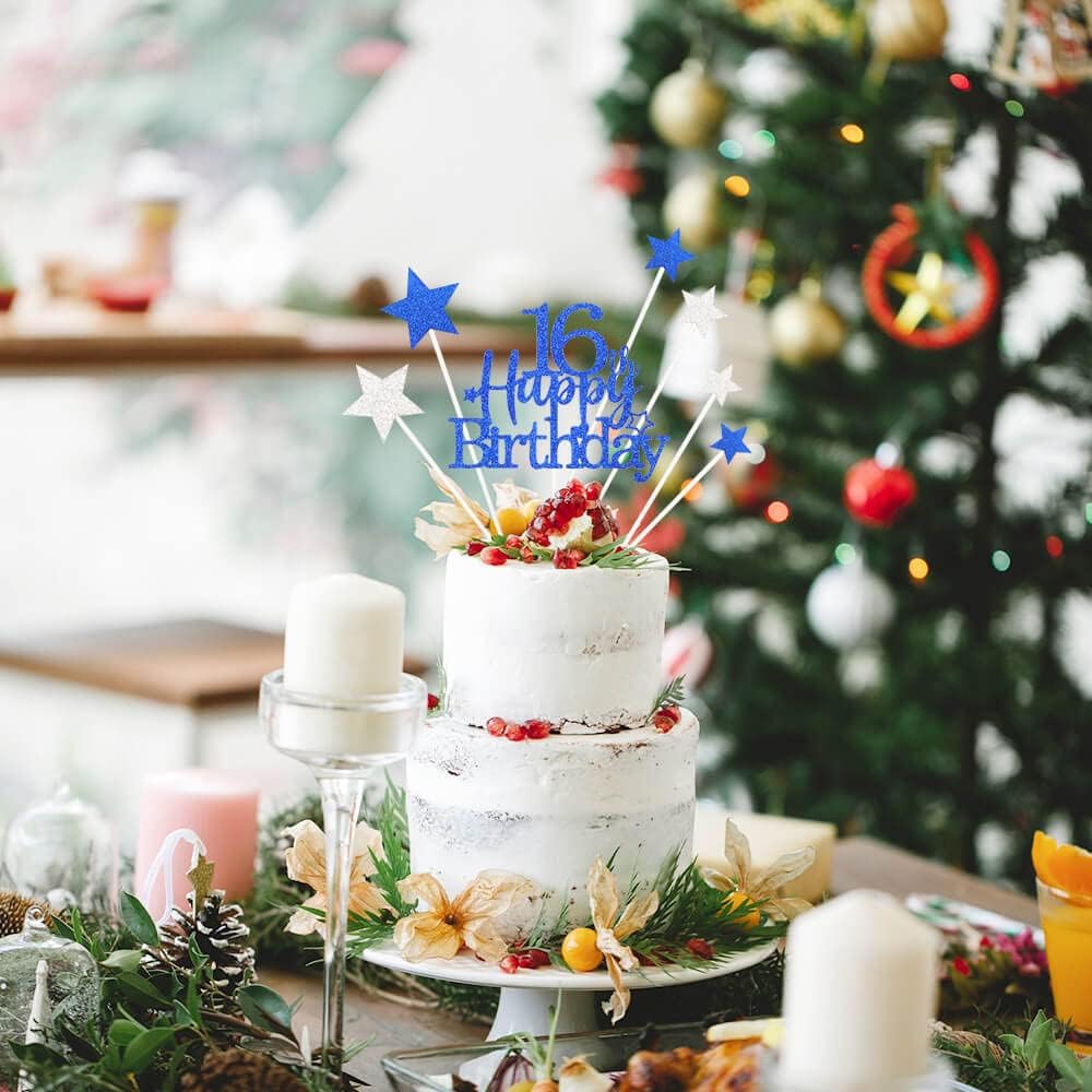 Glittery 16th Cake Topper with Star Boys and Girls 16th Birthday Party Supplies, Sixteen Years Old Birthday Party Decorations Royal Blue