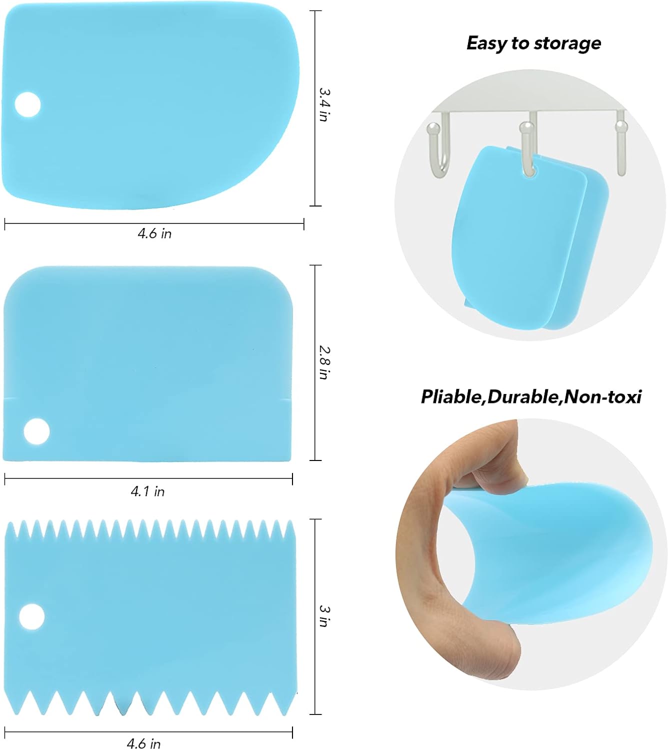 - Durable cake scrapers: Made of food grade plastic, reusable, non-toxic and durable. Non-stick, easy to clean. The arc cake smoother is great for getting the last of the dough out of a bowl, the linear scraper cutters for smoothing icing and the sawtooth cake icing scraper for cake decoration.