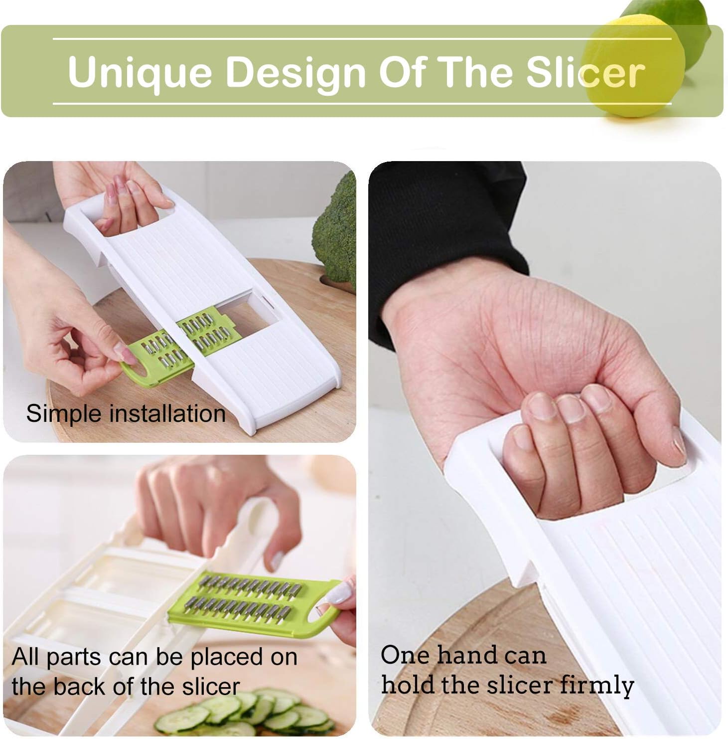 - [Compact & Easy to use] Simple structure.Simple operation.All 5 slicing options are built-in on our device.No need to fold or assemble.It's easy to replace these blades.Vegetables and fruits can be cut directly without reprocessing.It is perfect for small job in the kitchen.Allows you to spend less time preparing food and having more time for your family