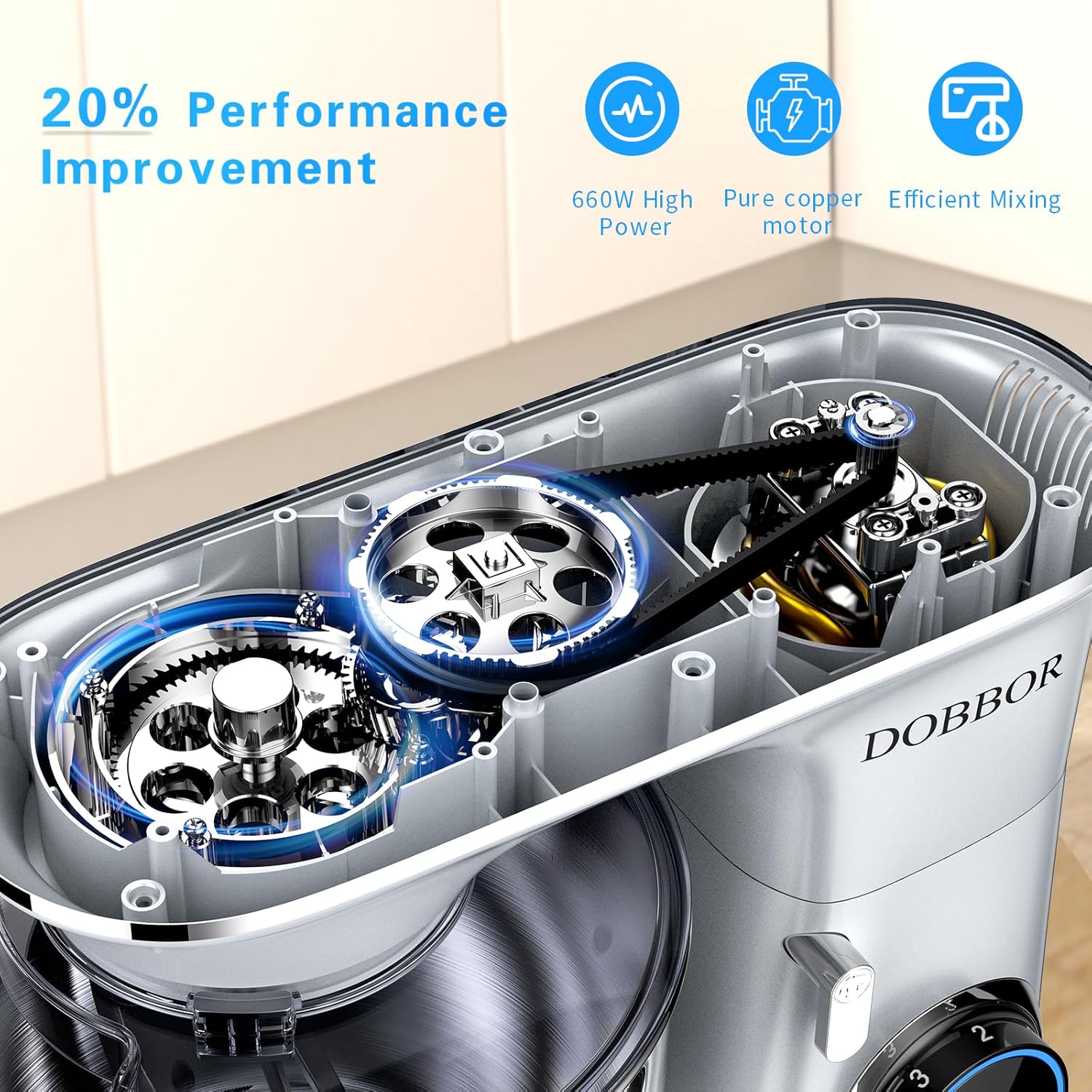 DOBBOR Electric Stand mixer, 9.5QT 660W 6 Speeds Tilt-Head Dough Mixers, Bread Mixer with Dough Hook, Whisk, Beater, Splash Guard for Baking Bread, Cake, Cookie, Pizza, Muffin, Salad and More - Sliver
